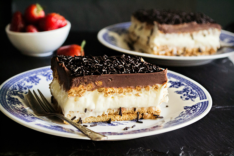 Υλικά 2 ½ πακέτα μπισκότα τύπου πτι μπερ 200 ml γάλα φρέσκο 50 ml κονιάκ ή λικέρ Για την κρέμα βανίλιας 80 γρ. κόρν φλάουρ 180 γρ. ζάχαρη 1 φασόλι βανίλιας 2 κρόκους αυγών 850 ml γάλα 1 κ.γ. βούτυρο ¼ κ.γ. αλάτι 150 ml κρέμα γάλακτος Για την επικάλυψη 250 ml κρέμα γάλακτος 300 γρ. κουβερούρα ΙΟΝ 1 κ.γ. βούτυρο Τρούφα ΙΟΝ Εκτέλεση Κρέμα βανίλιας Στον κάδο του μίξερ χτυπάμε 1 φλιτζάνι από το γάλα, το κορν φλάουρ, την ζάχαρη, τους κρόκους και το αλάτι. Βάζουμε το υπόλοιπο γάλα να ζεσταθεί ελαφρά, προσθέτουμε το μείγμα που ετοιμάσαμε, τα σποράκια της βανίλιας και ανακατεύουμε σε χαμηλή θερμοκρασία μέχρι να δέσει η κρέμα. Αποσύρουμε, προσθέτουμε το βούτυρο και την αφήνουμε να κρυώσει ελαφρά. Χτυπάμε την κρέμα γάλακτος σε σφικτή σαντιγί και την ομογενοποιούμε στην κρέμα βανίλιας. Επικάλυψη σοκολάτας Ψιλοκόβουμε την κουβερτούρα και ζεσταίνουμε την κρέμα γάλακτος να πάρει μια-δύο βράσεις, περιχύνουμε την κουβερτούρα, προσθέτουμε το βούτυρο και ανακατεύουμε συνεχώς μέχρι να ομογενοποιηθεί το μείγμα. Αφήνουμε να έρθει σε θερμοκρασία δωματίου. Συναρμολόγηση Σε ένα μπολ ανακατεύουμε το γάλα με το κονιάκ. Σε ένα μέτριο ταψί κάνουμε δύο στρώσεις από μπισκότα, τα οποία πρώτα βουτάμε για λίγο στο γάλα. Από επάνω ρίχνουμε την κρέμα βανίλιας και κάνουμε ακόμη μια στρώση με μπισκότα. Περιχύνουμε με την ρευστή επικάλυψη σοκολάτας και τοποθετούμε στο ψυγείο για 3-4 ώρες να σταθεροποιηθεί. Πριν σερβίρουμε πασπαλίζουμε με τρούφα. Tips Μπορούμε αν θέλουμε να χωρίσουμε την κρέμα βανίλιας σε δύο δόσεις και την μια να την κάνουμε σοκολατένια προσθέτοντας 2 κουταλιές της σούπας κακάο ΙΟΝ, ανάμεσα από τις δύο κρέμες κάνουμε μια στρώση με μπισκότα. Πηγή: https://www.ionsweets.gr/