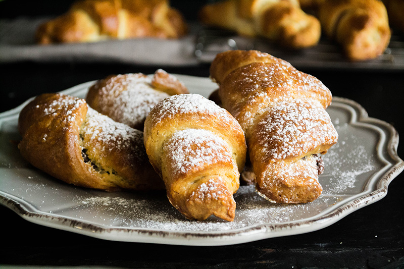 Υλικά Για τη ζύμη 520 γρ. αλεύρι για τσουρέκια 6 γρ. μαγιά στιγμής ¾ κουταλάκια του γλυκού baking powder 200 ml γάλα 190 γρ. βούτυρο 1 μεγάλο αυγό 1 κ.σ. ζάχαρη 1 κ.γ. αλάτι 1 βανιλλίνη Για τη γέμιση Nucrema ΙΟΝ Εκτέλεση Ζεσταίνουμε το γάλα και κόβουμε το βούτυρο σε κυβάκια. Στον κάδο του μίξερ ανακατεύουμε το γάλα, την ζάχαρη, το baking powder και την μαγιά, για 1'. Προσθέτουμε το βούτυρο, το αυγό, το αλάτι, την βανιλλίνη και το αλεύρι ζυμώνουμε σύντομα μέχρι να πάρουμε μια ελαστική ζύμη. Τυλίγουμε με μεμβράνη και αφήνουμε 40' στο ψυγείο. Προθερμαίνουμε τον φούρνο στους 180 °C. Χωρίζουμε την ζύμη σε 2 ισόποσα κομμάτια, με τον πλάστη ανοίγουμε ένα στρογγυλό φύλλο. Με την ρόδα κοπής κόβουμε σε 8 ισομεγέθη τρίγωνα, ξεκινώντας από την μέση. Στην άκρη της μεγάλης πλευράς τοποθετούμε 1 κουταλάκι του γλυκού Nucrema ΙΟΝ, τυλίγουμε και κλείνουμε καλά δίνοντας σχήμα μισοφέγγαρου. Χτυπάμε ελαφρά το αυγό με το γάλα και αλείφουμε τα κρουασάν. Ψήνουμε στους 180 °C για περίπου 20'. Πασπαλίζουμε με άχνη ζάχαρη. Tips Μπορούμε να γεμίσουμε τα κρουασάν με ένα μείγμα από Nucrema και μαρμελάδα ή με τυρί κρέμα και Nucrema. Αν θέλουμε μπορούμε να σιροπιάσουμε τα κρουασάν και να πασπαλίσουμε με καρύδι. Πηγή: https://www.ionsweets.gr/