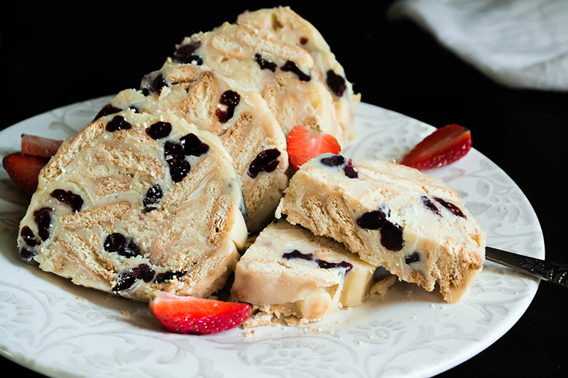 Υλικά 200 γρ. βούτυρο 200 γρ. λευκή κουβερτούρα ΙΟΝ 250 γρ. μπισκότα 150 γρ. ζαχαρούχο γάλα 120 γρ. καρύδα αποξηραμένη 50 γρ. ξηρούς καρπούς αλατισμένους 150 γρ. κράνμπερις αποξηραμένα 50 ml λικέρ μαστίχα Εκτέλεση Σε ένα μπολ σπάμε τα μπισκότα, σε ακανόνιστα κομμάτια με τα χέρια μας, προσθέτουμε την καρύδα, τα κράνμπερις, τους ξηρούς καρπούς χοντροκομμένους και περιχύνουμε με το λικέρ μαστίχα. Σε μπεν μαρί λιώνουμε την λευκή σοκολάτα ψιλοκομμένη, το ζαχαρούχο γάλα και το βούτυρο, σε χαμηλή θερμοκρασία. Αποσύρουμε και περιχύνουμε τα μπισκότα με το ζεστό μείγμα λευκής σοκολάτας. Ανακατεύουμε και μεταφέρουμε το μείγμα σε αντικολλητικό χαρτί ή σε μακρόστενη φόρμα που έχουμε στρώσει αντικολλητικό χαρτί. Κλείνουμε καλά και το αφήνουμε στο ψυγείο να παγώσει για 4 ώρες. Αφήνουμε 30' εκτός ψυγείου πριν σερβίρουμε. Tips Στον κορμό μπορούμε να προσθέσουμε ξηρούς καρπούς αλλά και αποξηραμένα φρούτα της αρεσκείας μας. Πηγή: https://www.ionsweets.gr/