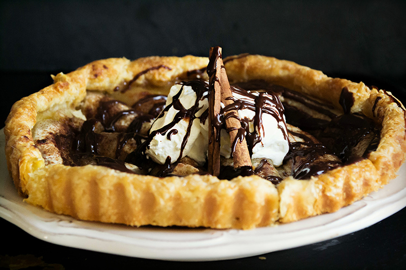 Υλικά Για την τάρτα 1 φύλλο σφολιάτας 3 μπανάνες ώριμες 2 κουταλιές της σούπας μαύρη ζάχαρη 30 γρ. βούτυρο 1 φασόλι βανίλιας 50 ml ρούμι ή κονιάκ Κανέλα Για την σάλτσα σοκολάτας 100 γρ. κουβερτούρα ΙΟΝ 80 γρ. κρέμα γάλακτος Για το σερβίρισμα Παγωτό βανίλια Εκτέλεση Τάρτα Ανοίγουμε το φύλλο σφολιάτας και απλώνουμε σε ταρτιέρα με αποσπόμενο πάτο. Κόβουμε τις μπανάνες στην μέση κατά μήκος και γεμίζουμε την τάρτα. Λιώνουμε το βούτυρο και περιχύνουμε τις μπανάνες και πασπαλίζουμε με την ζάχαρη. Ανοίγουμε το φασόλι της βανίλιας, ανακατεύουμε τους σπόρους με το κονιάκ και περιχύνουμε τις μπανάνες. Ψήνουμε την τάρτα για 35 - 40' στους 175 °C. Σάλτσα σοκολάτας Ψιλοκόβουμε την κουβερτούρα και ζεσταίνουμε την κρέμα γάλακτος να πάρει μια βράση, περιχύνουμε την κουβερτούρα, προσθέτουμε το μέλι και ανακατεύουμε συνεχώς μέχρι να ομογενοποιηθεί το μείγμα. Όταν ψηθεί η τάρτα σερβίρουμε με μπάλες παγωτού και σάλτσα σοκολάτας. Tips Μπορούμε να χρησιμοποιήσουμε όποια γεύση παγωτού μας αρέσει ή και παγωμένη άγλυκη σαντιγί! Πηγή: https://www.ionsweets.gr/