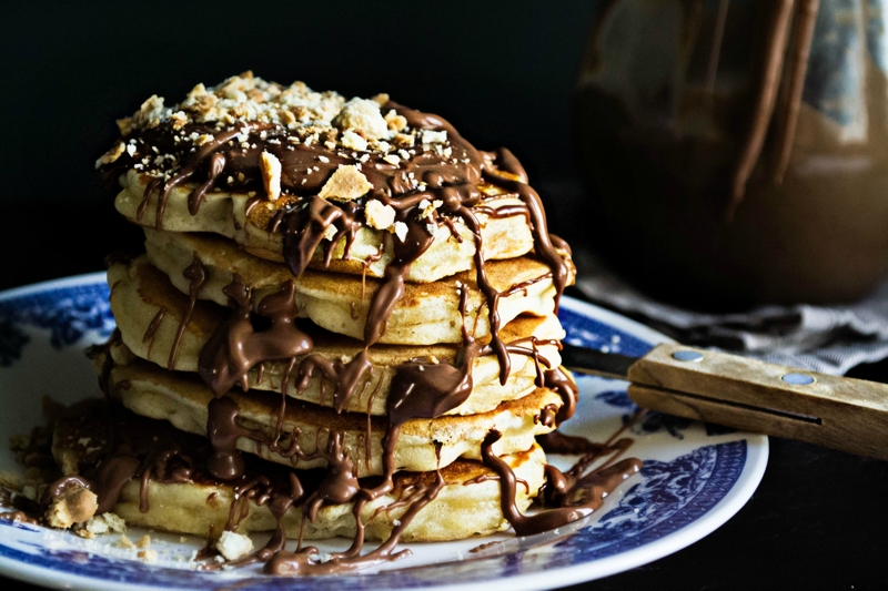 Υλικά 170 γρ. αλεύρι για όλες τις χρήσεις 100 ml γάλα εβαπορέ 120 ml νερό 60 γρ. βούτυρο 1 μεγάλο αυγό 2 κ.γ. ζάχαρη 1 ¾ κ.γ. baking powder ½ κ.γ. μαγειρική σόδα ¼ κ.γ. αλάτι 1 κ.γ. ξύδι Για το σερβίρισμα Nucrema ΙΟΝ Φουντουκόψιχα Μπισκότα Εκτέλεση Λιώνουμε το βούτυρο σε χαμηλή θερμοκρασία. Σε ένα μπoλ κοσκινίζουμε το αλεύρι, το baking powder, την μαγειρική σόδα και το αλάτι. Σε ένα άλλο μπoλ ανακατεύουμε το νερό, το γάλα, την ζάχαρη, το αυγό. Προσθέτουμε το μείγμα με το αλεύρι και το βούτυρο. Τέλος προσθέτουμε το ξύδι, ανακατεύουμε και αφήνουμε στο ψυγείο για 30'. Βάζουμε ένα αντικολλητικό τηγάνι να ζεσταθεί καλά, ρίχνουμε ελάχιστο βούτυρο και σχηματίζουμε με ένα κουτάλι ομοιόμορφες τηγανίτες. Κάθε φορά ψήνουμε ένα pancake, ανάλογα με το πόσο μεγάλο είναι το τηγάνι που χρησιμοποιούμε. Τοποθετούμε τα pancakes σε στοίβα και περιχύνουμε με την Nucrema, σπασμένα μπισκότα και την φουντουκόψιχα. Tips Μπορούμε να χρησιμοποιήσουμε και γάλα φρέσκο ή ξινόγαλα. - Μπορούμε να σερβίρουμε επιπλέον με φρούτα και Nucrema. Πηγή: https://www.ionsweets.gr/