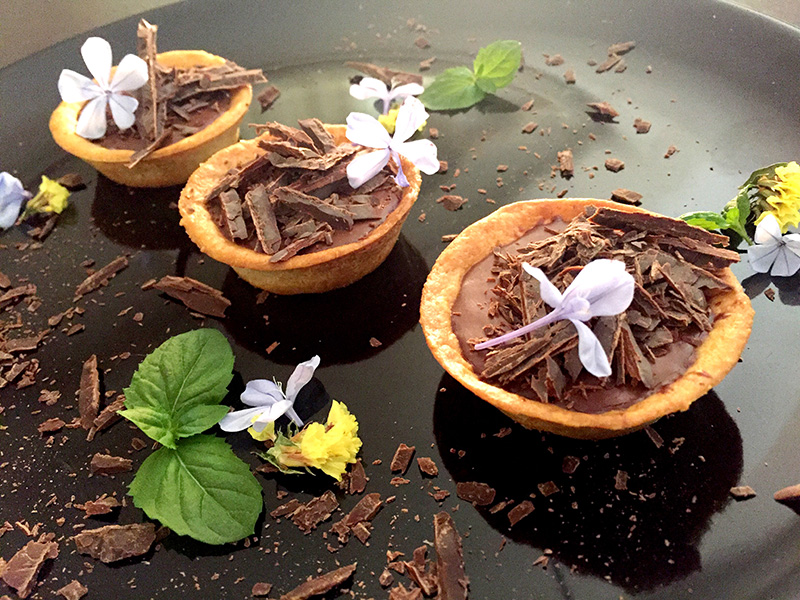 Υλικά Για την τάρτα 100 γρ. ζάχαρη 1 αυγό 300 γρ. αλεύρι για όλες τις χρήσεις 200 γρ. βούτυρο Για την γέμιση σοκολάτας 400 γρ. κρέμα γάλακτος. 250 γρ. κουβερτούρα ΙΟΝ Εκτέλεση Τάρτα Ανακατεύουμε όλα τα υλικά μαζί τρίβοντας τα με τα χέρια, η τοποθετώντας τα στη λεκάνη του mixer και χτυπάμε με φτερό μέχρι να φτιάξουμε μια εύπλαστη ζύμη. Τυλίγουμε την ζύμη σε μεμβράνη και την τοποθετούμε στο ψυγείο να ξεκουραστεί τουλάχιστον για 30'. Τοποθετώ τη ζύμη ανάμεσα σε 2 λαδόκολλες και την ανοίγω. Την κόβω σε τετράγωνα και γεμίζω τα φορμάκια, 6 εκατοστών, αφαιρώντας ότι περισσεύει με το μαχαίρι. Τρυπάω τη ζύμη με ένα πιρούνι βάζω λαδόκολλα και από πάνω βάρος (φασόλια). Ψήνω στους 170 °C για 15'. Όταν τα ταρτάκια μας ψηθούν τα αφήνουμε να κρυώσουν λίγο και τα ξεφορμάρουμε. Γέμιση σοκολάτας Ζεσταίνω την κρέμα σε ένα κατσαρολάκι. Ψιλοκόβω την κουβερτούρα ΙΟΝ και την ανακατεύω με την κρέμα γάλακτος. Βάζω την δεύτερη κρέμα γάλακτος στο mixer και την χτυπάω μέχρι να γίνει σαντιγί. Την προσθέτω στο μείγμα και ομογενοποιώ. Γεμίζω τα ταρτάκια και τα τοποθετώ στο ψυγείο τουλάχιστον για μια ώρα. Συναρμολόγηση Βάζουμε τα ταρτάκια μας σε ένα πιάτο . Ψιλοκόβουμε κουβερτούρα ΙΟΝ και τα πασπαλίζουμε . Τα στολίζουμε με λουλούδια και μέντα . Πηγή: https://www.ionsweets.gr/