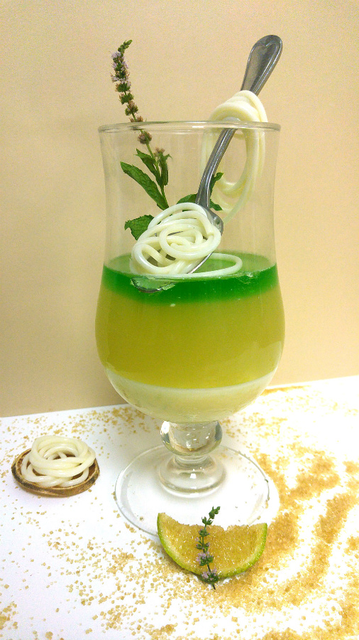 Υλικά Για το γκανάζ 100 γρ. λευκή κουβερτούρα ΙΟΝ 100 γρ. κρέμα γάλακτος 8 γρ. ξύσμα lime Για το ζελέ mojito 300 γρ. νερό 100 γρ. ρούμι 3 γρ. ξύσμα lime 35 γρ. χυμό lime 50 γρ. καστανή ζάχαρη 50 γρ. ζάχαρη λευκή κρυσταλλική 3 φύλλα δυόσμου ψιλοκομμένα 12 γρ. φύλλα ζελατίνας Για το ζελέ 125 γρ. νερό 25 γρ. ζάχαρη λευκή κρυσταλλική 5 φύλλα δυόσμου ψιλοκομμένα 5 γρ. φύλλα ζελατίνας Για το «Σπαγγέτι» λευκής σοκολάτας 120 γρ. λευκή κουβερτούρα ΙΟΝ 15 γρ. ρούμι 400 γρ. νερό 30 γρ. ζάχαρη άχνη 6,5 γρ. αγάρ - αγάρ Οδηγίες Γκανάζ λευκής σοκολάτας Λιώνουμε την λευκή σοκολάτα σε μπεν-μαρί και προσθέτουμε το ξύσμα lime. Παράλληλα ζεσταίνουμε την κρέμα γάλακτος και την προσθέτουμε στα προηγούμενα υλικά ανακατεύοντας με το σύρμα μέχρι να ενσωματωθούν πλήρως. Αφήνουμε το γκανάζ λευκής σοκολάτας να χλιαρώσει. Ζελέ mojito Τοποθετούμε τα φύλλα ζελατίνας μέσα σε μια λεκάνη με κρύο νερό έτσι ώστε να απορροφήσουν νερό και να μαλακώσουν. Μέσα σε μια κατσαρόλα ρίχνουμε το νερό, το ρούμι, το ξύσμα lime, το χυμό lime, τη καστανή ζάχαρη, την ζάχαρη λευκή κρυσταλλική και τα φύλλα δυόσμου ψιλοκομμένα και τα βράζουμε. Προσθέτουμε τα φύλλα ζελατίνας (καλά στραγγισμένα) και ανακατεύουμε με ένα σύρμα. Μόλις λιώσουν αποσύρουμε την κατσαρόλα από την φωτιά, αφήνουμε το ζελέ mojito να χλιαρώσει και αφαιρούμε τα ψιλοκομμένα φύλλα δυόσμου με ένα κουταλάκι. Ζελέ δυόσμου Τοποθετούμε τα φύλλα ζελατίνας μέσα σε μια λεκάνη με κρύο νερό έτσι ώστε να απορροφήσουν νερό και να μαλακώσουν. Μέσα σε μια κατσαρόλα ρίχνουμε το νερό, την ζάχαρη λευκή κρυσταλλική και τα βράζουμε. Προσθέτουμε τα φύλλα ζελατίνας (καλά στραγγισμένα) και ανακατεύουμε με ένα σύρμα. Μόλις λιώσουν αποσύρουμε την κατσαρόλα από την φωτιά, αφήνουμε το ζελέ δυόσμου να χλιαρώσει και αφαιρούμε τα ψιλοκομμένα φύλλα δυόσμου με ένα κουταλάκι. Σπαγγέτι λευκής σοκολάτας Λιώνουμε την λευκή σοκολάτα σε μπεν-μαρί. Τοποθετούμε μέσα σε μια κατσαρόλα το ρούμι, το νερό, την ζάχαρη άχνη και το agar-agar, ανακατεύουμε με σύρμα και τα φτάνουμε σε σημείο βρασμού. Προσθέτουμε την λευκή σοκολάτα (εκτός φωτιάς) και ανακατεύουμε με σύρμα. Με μια σύριγγα τραβάμε το περιεχόμενο. Τοποθετούμε ένα σωληνάκι στη σύριγγα και πιέζουμε το περιεχόμενο έτσι ώστε να γεμίσει όλο το σωληνάκι. Τοποθετούμε σε κρύο μπεν-μαρί (λεκάνη με κρύο νερό) και αφήνουμε να σταθεροποιηθεί το περιεχόμενο από το σωληνάκι για 15' περίπου. Συναρμολόγηση Σε ένα ποτήρι της αρεσκείας μας τοποθετούμε αρχικά το γκανάζ λευκής σοκολάτας και το βάζουμε στο ψυγείο να σταθεροποιηθεί για 30' περίπου. Στη συνέχεια προσθέτουμε το ζελέ mojito και επανατοποθετούμε το ποτήρι στο ψυγείο για 1 ώρα περίπου. Τέλος προσθέτουμε και το ζελέ δυόσμου και επανατοποθετούμε στο ψυγείο για επίσης 1 ώρα περίπου. Προαιρετικά για το ντεκόρ, λίγο πριν να το σερβίρουμε, πιέζουμε την σύριγγα με το σωληνάκι και τοποθετούμε το περιεχόμενο πάνω στο ζελέ δυόσμου ή όπου αλλού επιθυμούμε. Πηγή: https://www.ionsweets.gr/