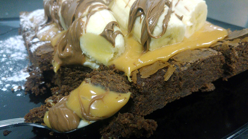 Υλικά Για το μπράουνις 175 γρ. σοκολάτα κουβερτούρα ΙΟΝ ψιλοκομμένη 125 γρ. βούτυρο 100 γρ. αβγά 110 γρ. ζάχαρη κρυσταλλική 1 κάψουλα βανιλλίνη 40 γρ. αλεύρι μαλακό 5 γρ. baking powder 90 γρ. φιστίκι Αιγίνης 110 γρ. σοκολάτα κουβερτούρα ΙΟΝ ψιλοκομμένη Για το Dulce de Leche 1 μικρό κουτάκι γάλα ζαχαρούχο Για τις μπανάνες 2 τεμάχια μπανάνες Για την ντεκόρ με Νucrema 100 γρ. Νucrema ΙΟΝ Εκτέλεση Brownies Τοποθετούμε μέσα σε μια λεκάνη και σε μπεν-μαρί την μαύρη σοκολάτα ψιλοκομμένη και το βούτυρο και τα αφήνουμε να λιώσουν ανακατεύοντας με μια μαρίζ. Μέσα στο κάδο του μίξερ τοποθετούμε τα αυγά, την κρυσταλλική ζάχαρη, την βανιλλίνη και ανακατεύουμε με το σύρμα μέχρι να διογκωθούν στο διπλάσιο. Αποσύρουμε το κάδο από το μίξερ και προσθέτουμε τα λιωμένα υλικά του μπεν-μαρί (σοκολάτα και βούτυρο) μέσα στο κάδο και ανακατεύουμε με μια μαρίζ μέχρι να ομογενοποιηθούν πολύ καλά μεταξύ τους. Τέλος προσθέτουμε το μαλακό αλεύρι, το baking powder, το φιστίκι Αιγίνης και την ψιλοκομμένη μαύρη σοκολάτα και συνεχίζουμε το ανακάτεμα με την μαρίζ μέχρι την πλήρη ομογενοποίηση όλων των υλικών. Βάζουμε το μείγμα του brownies μέσα σε ένα ταψάκι με αντικολλητικό χαρτί και ψήνουμε σε προθερμασμένο φούρνο στους 180 °C για 25' περίπου. Με την έξοδο από τον φούρνο αφήνουμε να κρυώσει το brownies και αναποδογυρίζουμε. Dulce de Leche Τοποθετούμε ένα μικρό κουτί ζαχαρούχο γάλα μέσα σε μια κατσαρόλα με νερό και το βράζουμε σε χαμηλή φωτιά για 3 ώρες περίπου. Προσέχουμε κατά την διάρκεια του βρασμού το κουτί να είναι καλυμμένο πλήρως με νερό (αν χρειαστεί συμπληρώνουμε λίγο ζεστό νερό). Στην συνέχεια αποσύρουμε από την φωτιά και αφήνουμε το βρασμένο ζαχαρούχο γάλα να κρυώσει. Τέλος ανοίγουμε το δοχείο και το Dulce de Leche είναι έτοιμο. Συναρμολόγηση Σε σκεύος της αρεσκείας μας τοποθετούμε το μπράουνις, απλώνουμε στην επιφάνεια του Dulce de Leche , κόβουμε τις μπανάνες εγκάρσια και τις τοποθετούμε από πάνω. Τέλος προσθέτουμε για ντεκόρ Nucrema σε ακανόνιστες γραμμές. Πηγή: https://www.ionsweets.gr
