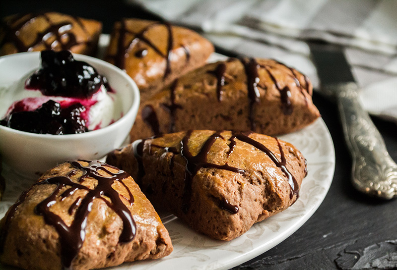 Υλικά 125 γρ. αλεύρι που φουσκώνει μόνο του 20 γρ. κακάο ΙΟΝ 50 γρ. βούτυρο 75 ml γάλα φρέσκο 1 κ.γ. ζάχαρη άχνη ¼ κ.γ. αλάτι 2 κ.σ. γάλα για το άλειμμα 50 γρ. κουβερτούρα ΙΟΝ Εκτέλεση Σε ένα λεκανάκι τρίβουμε το παγωμένο βούτυρο με το αλεύρι να γίνουν σαν ψίχουλα, προσθέτουμε την ζάχαρη, το κακάο, το αλάτι και το κρύο γάλα. Ζυμώνουμε ελαφρά να ομογενοποιηθούν τα υλικά. Απλώνουμε την ζύμη σε αλευρωμένο πάγκο και την πιέζουμε με την παλάμη μας να ανοίξει σε χοντρό φύλλο, περίπου 1,5 εκατοστό. Κόβουμε με κοφτερό μαχαίρι την ζύμη, σε 8 τρίγωνα – scones. Τοποθετούμε σε αντικολλητικό χαρτί και ψήνουμε στους 175 °C για περίπου 20' και αφήνουμε να κρυώσουν. Λιώνουμε την κουβερτούρα και περιχύνουμε τα scones. Τα scones είναι ιδανικά για πρωινό με μαρμελάδα, βούτυρο, τυρί κρέμα, γιαούρτι ή σαντιγί . Tips Αν θέλετε μπορείτε να προσθέσετε στα scones κομματάκια σοκολάτας. Τα scones μπορούν να φτιαχτούν και με αλεύρι ολικής απλά ίσως χρειαστεί περισσότερο γάλα. Πηγή: https://www.ionsweets.gr