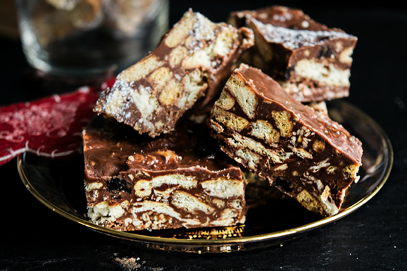 Υλικά 200 γρ. κουβερτούρα ΙΟΝ 150 γρ. λευκή κουβερτούρα ΙΟΝ 250 γρ. διάφορα μπισκότα 50 γρ. μαύρες σταφίδες 100 γρ. παστέλι 130 γρ. golden syrup 80 γρ. βούτυρο 50 ml κονιάκ, προαιρετικά Εκτέλεση Μουλιάζουμε τις σταφίδες στο κονιάκ. Λιώνουμε τις κουβερτούρες σε μπαιν μαρί, προσθέτουμε το golden syrup και το βούτυρο, ανακατεύουμε καλά να ομογενοποιηθεί το μείγμα. Σπάμε τα μπισκότα σε χοντρά κομμάτια, θρυμματίζουμε το παστέλι και τα προσθέτουμε στο μείγμα σοκολάτας, τέλος προσθέτουμε τις σταφίδες με το κονιάκ. Ανακατεύουμε καλά και μεταφέρουμε σε ένα μικρό ορθογώνιο σκεύος, του οποίου τον πάτο έχουμε καλύψει με αντικολλητικό χαρτί. Αφήνουμε το γλυκό εκτός ψυγείου να σταθεροποιηθεί για 4-5 ώρες. Κόβουμε σε μικρές μπάρες και διατηρούμε εκτός ψυγείο σε σκεύος που κλείνει ερμητικά. Tips Μπουρούμε να χρησιμοποιήσουμε όποιο αποξηραμένο φρούτο μας αρέσει, ξηρούς καρπούς και μπισκότα. Αν θέλουμε αντικαθιστούμε το κονιάκ με λικέρ ή το παραλείπουμε. Για πιο γιορτινό «γεύση» προσθέτουμε μπαχαρικά ή ξύσμα πορτοκαλιού. Πηγή: https://www.ionsweets.gr