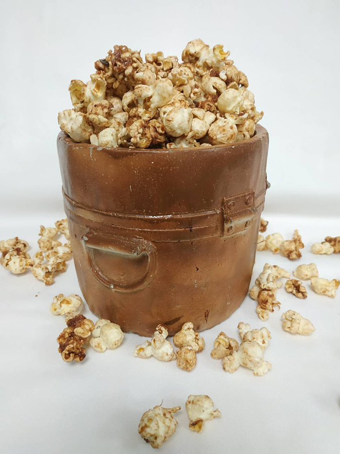 Υλικά 80 γρ βούτυρο 70 γρ ζάχαρη καστανή 2 δόσεις βανιλλίνη 60 γρ κουβερτούρα γάλακτος ΙΟΝ (ψιλοκομμένη) 35 γρ γλυκόζη 1 γρ αλάτι 70 γρ Νucrema ΙΟΝ 35 γρ φουντούκια λεπτοσπασμένα 250 γρ pop corn Εκτέλεση Τοποθετούμε το βούτυρο, την καστανή ζάχαρη και την βανιλλίνη μέσα σε μια κατσαρόλα και ανακατεύουμε με το σύρμα σε μέτρια φωτιά. Μόλις τα παραπάνω υλικά λιώσουν, προσθέτουμε την ψιλοκομμένη κουβερτούρα γάλακτος ΙΟΝ, την γλυκόζη, το αλάτι, την Νucrema και τα λεπτοσπασμένα φουντούκια και συνεχίζουμε να ανακατεύουμε με το σύρμα μέχρι να λιώσουν όλα τα υλικά και να ομογενοποιηθούν μεταξύ τους. Προσοχή το μείγμα δεν πρέπει να βράσει αλλά απλώς να ζεσταθεί. Τοποθετούμε τα pop corn σε μια λεκάνη. Αποσύρουμε την κατσαρόλα από την φωτιά και προσθέτουμε το γκανάζ μέσα στην λεκάνη με τα pop corn ανακατεύοντας με μια μαρίζ. Απλώνουμε σε ένα ταψί με αντικολλητικό χαρτί ψησίματος τα pop corn επίπεδα και ψήνουμε σε προθερμασμένο φούρνο στους 180 °C για 10 '. Σερβίρουμε σε πιατέλα της αρεσκείας μας. Πηγή: https://www.ionsweets.gr/