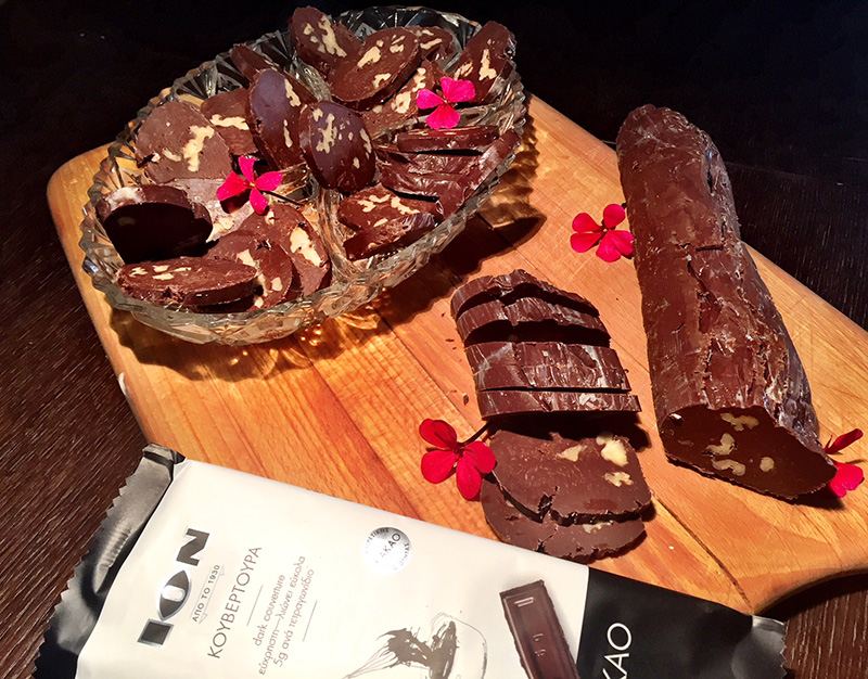 Συστατικά 500 γρ. κουβερτούρα ΙΟΝ 1 ζαχαρούχο γάλα 200 γρ. καρύδια Οδηγίες Βάζουμε τη σοκολάτα σε ένα μπολ να λιώσει με τη μέθοδο του μπεν μαρί. Μόλις λιώσει κατεβάζουμε από τη φωτιά και προσθέτουμε το ζαχαρούχο γάλα και τα καρύδια. Ομογενοποιούμε με μια σπάτουλα. Παίρνουμε ένα φύλλο λαδόκολλα και αδειάζουμε πάνω το μείγμα. Με τη βοήθεια της σπάτουλας στρώνουμε τη σοκολάτα σαν λουκάνικο και τυλίγουμε κλείνοντας τις άκρες. Τοποθετούμε στο ψυγείο για περίπου 3 ώρες. Μόλις παγώσει ξετυλίγουμε και κόβουμε σε ροδέλες. Πηγή: https://www.ionsweets.gr/