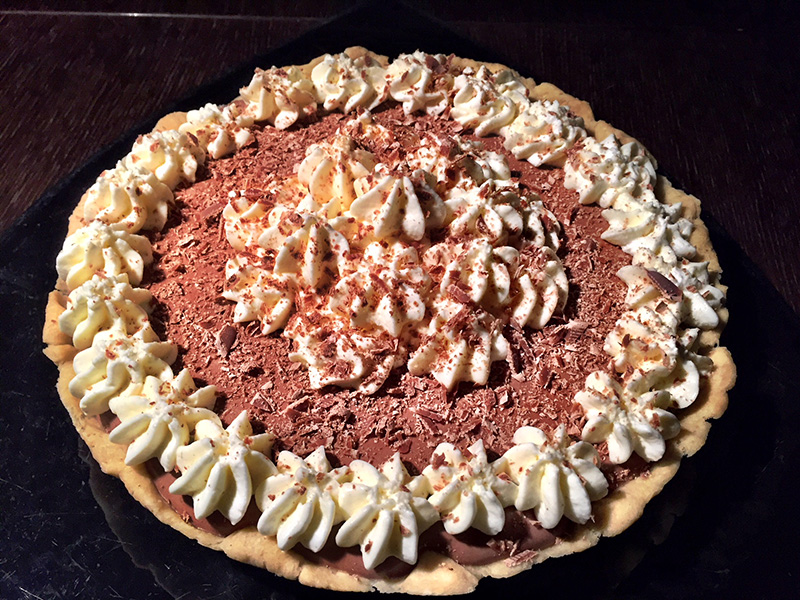Υλικά Υλικά για την τάρτα 300 γρ αλεύρι 200 γρ βούτυρο μαλακό 1 αυγό 100 γρ άχνη ζάχαρη Για την γέμιση με την σοκολάτα 70 γρ κακάο ΙΟΝ 50 γρ κορν φλάουρ 70 γρ άχνη ζαχαρη 1 πρέζα αλάτι 80 γρ σοκολατούχο γάλα 175 γρ τυρί κρέμα 400 γρ γάλα συμπυκνώμενο 400 γρ κρέμα γάλακτος 35% χτυπημένη σε σαντιγί 28 γρ ζελατίνη 1 κουβερτούρα γάλακτος ΙΟΝ για το γαρνίρισμα Για την σαντιγί 2 κ.γ ζελατίνη 8 κ.γ νερό κρύο 400 γρ κρέμα γάλακτος 35% 1 βανίλια Εκτέλεση Πίτα Ανακατεύουμε το αλεύρι με το βούτυρο τρίβοντας με τα χέρια μας. Προσθέτουμε το αυγό και την άχνη ζάχαρη. Φτιάχνουμε μια εύπλαστη ζύμη. Τώρα μπορούμε να φτιάξουμε μια μεγάλη τάρτα ή δυο μικρές χωρίζοντας τη ζύμη μας στα δυο. Γέμιση σοκολάτας Σε ένα μπολ βάζουμε το κακάο, το κορν φλάουρ, την άχνη και το γάλα. Χτυπάμε με σύρμα να ομογενοποιηθούν τα υλικά. Στον κάδο του μίξερ βάζουμε το τυρί κρέμα και το συμπυκνωμένο γάλα και το χτυπάμε με σύρμα. Ενώνουμε τα δυο μείγματα. Σε ένα βαθύ πιάτο βάζουμε 6 φύλλα ζελατίνη να μουλιάσουν. Όταν μαλακώσουν αφαιρούμε το νερό αφήνοντας ελάχιστο. Τοποθετούμε το πιάτο στο μικροκυμάτων για περίπου 30" μέχρι να υγροποιηθεί τελείως η ζελατίνη. Προσθέτουμε τη ζελατίνη στο μείγμα. Προσθέτουμε την σαντιγί και ομογενοποιούμε απαλά με μια σπάτουλα. Γεμίζουμε την τάρτα με την σοκολάτα και τοποθετούμε στο ψυγείο για τουλάχιστον 2-3 ώρες. Σαντιγί Βάζουμε την ζελατίνη μαζί με το κρύο νερό για 5'. Μετά τη βάζουμε στο μικροκυμάτων για 10" να υγροποιηθεί τελείως. Χτυπάμε την κρέμα γάλακτος στον κάδο του μίξερ με σύρμα μαζί με τη βανίλια, τέλος προσθέτουμε την ζελατίνη. Τοποθετούμε την σαντιγί σε μια σακούλα ζαχαροπλαστικής με μύτη και την αφήνουμε να ξεκουραστεί στο ψυγείο. Συναρμολόγηση Όταν η σοκολάτα έχει πήξει γαρνίρουμε με την σαντιγί και πασπαλίζουμε με τριμμένη κουβερτούρα γάλακτος ΙΟΝ. Πηγή: https://www.ionsweets.gr/