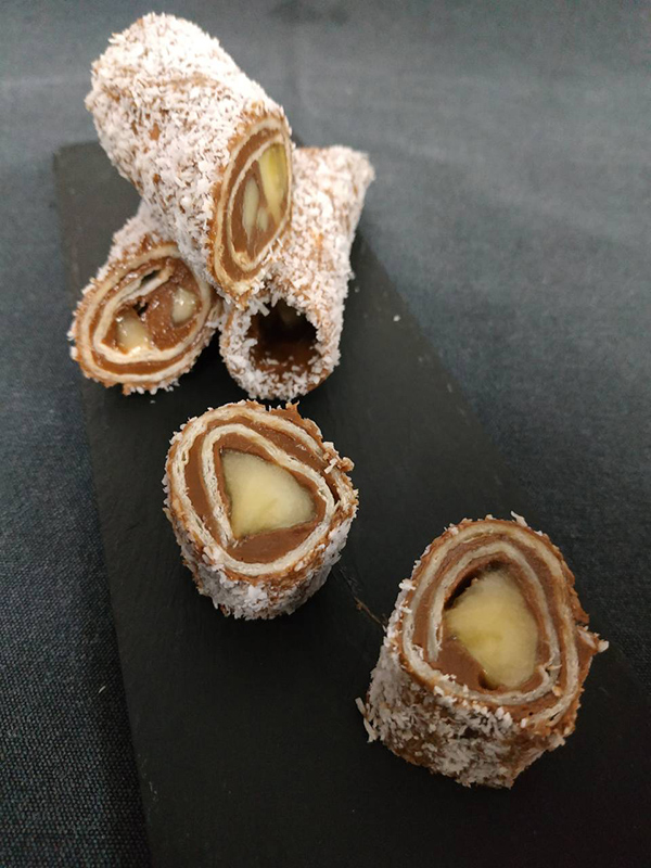 Υλικά 2 τεμάχια τορτίγια 200 γρ. Νucrema ΙΟΝ 4 τεμάχια μπανάνες (μεσαίου μεγέθους) 100 γρ. ινδική καρύδα Εκτέλεση Απλώνουμε στην επιφάνεια της τορτίγια, Νucrema με το κουτάλι σούπας σε μια λεπτή στρώση και σε όλη την επιφάνειά της. Τοποθετούμε 2 τεμάχια μπανάνες μεσαίου μεγέθους κατά μήκος της τορτίγια. Διπλώνουμε σε ρολό την τορτίγια. Τοποθετούμε για 30' στην κατάψυξη την τορτίγια. Στη συνέχεια βγάζουμε το ρολό από την κατάψυξη και με ένα πινέλο το αλείφουμε εξωτερικά με Νucrema. Επικαλύπτουμε σε όλη την εξωτερική επιφάνεια με ινδική καρύδα και τοποθετούμε για 2η φορά στην κατάψυξη για 15' περίπου. Κόβουμε σε τεμάχια όπως θα κάναμε αν κόβαμε σε μερίδες για ένα sushi (σε πάχος της αρεσκείας μας). Επαναλαμβάνουμε ακριβώς την ίδια διαδικασία και με το 2η τορτίγια. Πηγή: https://www.ionsweets.gr/