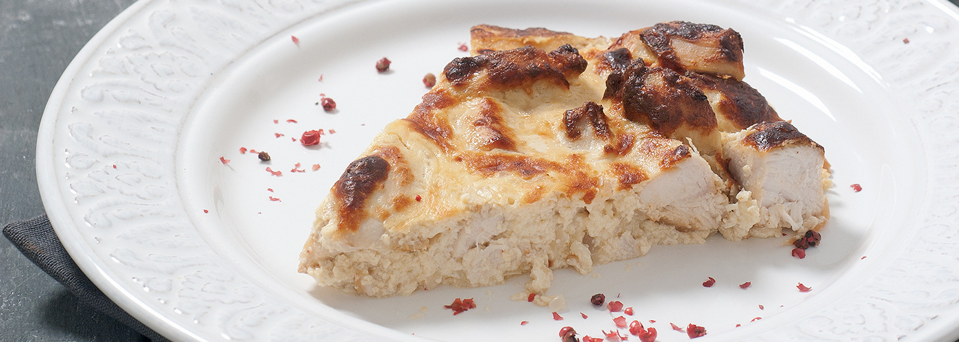 Υλικά 800 γρ. φιλέτο κοτόπουλο κομμένο σε κύβους 80 ml λευκό κρασί 200 γρ. κρεμμύδι ψιλοκομμένο 150 γρ. γραβιέρα Αργους 80 γρ. αμύγδαλο σπασμένο 500 γρ. γιαούρτι 1/2 ματσάκι δυόσμο ψιλοκομμένο 1/4 ματσάκι μαϊντανό ψιλοκομμένο 4 αυγά 50 ml ελαιόλαδο αλάτι, πιπέρι φρεσκοτριμμένο Εκτέλεση Σε αντικολλητικό τηγάνι και σε πολύ δυνατή φωτιά σοτάρουμε το κοτόπουλο με το ελαιόλαδο για 2-3', μέχρι να πάρει χρώμα. Προσθέτουμε το κρεμμύδι και σοτάρουμε για ακόμη 1'. Ρίχνουμε και το κρασί και μαγειρεύουμε μέχρι να εξατμιστεί. Αναμειγνύουμε το κοτόπουλο με το σπασμένο αμύγδαλο. Χτυπάμε μαζί τα αυγά, το γιαούρτι, τη γραβιέρα και τα αρωματικά, αλατοπιπερώνουμε και ανακατεύουμε το κοτόπουλο με το μείγμα του γιαουρτιού. Ρίχνουμε σε ταψί και ψήνουμε στον φούρνο στους 190 °C για 25'. Σερβίρουμε με σάλτσα πέστο και πράσινη σαλάτα. Πηγή: http://www.nitsiakos.gr