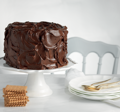 Υλικά Για 3 βάσεις κέικ σε ταψάκι 22 εκατοστών 135 γρ. κακάο 275 γρ. αλεύρι μαλακό 4 γρ. αλάτι 15 γρ. σόδα 8 γρ. baking powder 165 γρ. βούτυρο 450 γρ. κρυσταλλική ζάχαρη 150 γρ. αυγά 175 γρ. νερό 180 γρ. γάλα Για τη γκανάς 700 γρ. μαύρη σοκολάτα 275 γρ. κρέμα γάλακτος 35% 425 γρ. βούτυρο 225 γρ. μπισκότα πτι-μπερ Εκτέλεση Κοσκινίζουμε όλες τις σκόνες μαζί σε ένα μπολ. Βάζουμε το βούτυρο με τη ζάχαρη στο μίξερ να αφρατέψουν και προσθέτουμε τα αυγά ένα ένα. Προσθέτουμε τις μισές σκόνες και μετά τα υγρά. Αφού ομογενοποιηθούν προσθέτουμε και τις υπόλοιπες σκόνες. Χωρίζουμε το μείγμα στα 3 ταψιά και ψήνουμε στους 175 °C για 30 - 35'. Για να ετοιμάσουμε τη γκανάς, βράζουμε την κρέμα γάλακτος, τη ρίχνουμε στη θρυμματισμένη σοκολάτα και ανακατεύουμε. Όταν λιώσει, προσθέτουμε το βούτυρο. Βάζουμε 600 γραμμάρια σε άλλο μπολ και ρίχνουμε τα σπασμένα μπισκότα. Τοποθετούμε και τα δύο μπολ στο ψυγείο ώσπου να αρχίσουν να σφίγγουν. Στο πρώτο κομμάτι κέικ βάζουμε πάνω τη μισή κρύα γκανάς με τα μπισκότα. Επαναλαμβάνουμε και κλείνουμε με το τρίτο κομμάτι κέικ. Παίρνουμε την υπόλοιπη γκανάς και στρώνουμε εξωτερικά όλο το κέικ. Βάζουμε για λίγο στο ψυγείο και σερβίρουμε Πηγή: http://www.papadopoulou.gr/