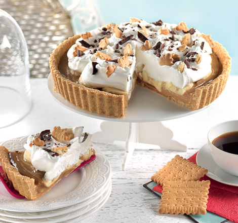 Υλικά Για την τάρτα 225 γρ. πτι-μπερ 110 γρ. βούτυρο Για τη σάλτσα καραμέλας 1 κουτάκι ζαχαρούχο γάλα Για την επικάλυψη 120 γρ. κρέμα γάλακτος 35% 1 μπανάνα 50 γρ. σοκολάτα κουβερτούρα 50 γρ. πτι-μπερ Εκτέλεση Βάζουμε το ζαχαρούχο γάλα μέσα σε μια κατσαρόλα με νερό τόσο όσο να είναι σκεπασμένο το κουτάκι από το ζαχαρούχο και βάζουμε την κατσαρόλα στη φωτιά να βράσει. Θέλει περίπου 3 ώρες για να γίνει καραμέλα βουτύρου. Φροντίζουμε να προσθέτουμε σιγά σιγά νερό κάθε φορά που αυτό αρχίζει να εξατμίζεται. Θρυμματίζουμε τα μπισκότα στο μούλτι. Λιώνουμε το βούτυρο και το ομογενοποιούμε. Σε μια βάση τάρτας βάζουμε το μείγμα με το μπισκότο και το απλώνουμε ομοιόμορφα πιέζοντάς το καλά. Το βάζουμε για λίγο στο ψυγείο να παγώσει. Από πάνω βάζουμε την καραμέλα βουτύρου και την απλώνουμε παντού με ένα κουτάλι. Πάνω από την καραμέλα βουτύρου απλώνουμε μπανάνες. Χτυπάμε την κρέμα γάλακτος στο μίξερ να σφίξει. Με μια σακούλα ζαχαροπλαστικής γαρνίρουμε από πάνω τη σαντιγί. Πάνω από τη σαντιγί προσθέτουμε κομματάκια σοκολάτας και μπισκότου. Βάζουμε για 1 ώρα στο ψυγείο. Η τάρτα είναι έτοιμη για σερβίρισμα. Πηγή: http://www.papadopoulou.gr/