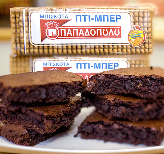 Υλικά 140 γρ. βούτυρο - Αρτιζάν Ideale 30 γρ. πτι-μπερ 65 γρ. αλεύρι - "Το Εκλεκτό" Χαλκιδικής 65 γρ. κακάο - "ΙΟΝ" 2 αυγά 250 γρ. ζάχαρη 1 βανίλια Αλάτι Εκτέλεση Τοποθετούμε σε μπεν-μαρί το βούτυρο, τη ζάχαρη, το κακάο και το αλάτι. Το αφήνουμε μέχρι να λιώσουν όλα τα συστατικά και το απομακρύνουμε από τη φωτιά Θρυμματίζουμε τα πτι-μπερ και τα προσθέτουμε στο μείγμα μαζί με τα αυγά, τη βανίλια και το αλεύρι. Ανακατεύουμε καλά μέχρι το μείγμα μας να γίνει ομοιογενές και παχύρρευστο. Βάζουμε το μείγμα μας σε ένα ταψάκι με λαδόκολλα και το ψήνουμε σε προθερμασμένο φούρνο στους 180 °C για περίπου 25 - 30'. Αν θέλουμε μπορούμε στο σερβίρισμα να πασπαλίσουμε λίγη ζάχαρη άχνη από πάνω. Πηγή: http://www.papadopoulou.gr/