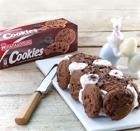 Υλικά 180 γρ./1 πακέτο cookies με κακάο και κομμάτια σοκολάτας Σοκολάτα κουβερτούρα (ξύσμα) 1 μπανάνα σε ροδέλες (προαιρετικά) Για το παγωτό 2 - 3 μέτριες μπανάνες 1 κουτί ζαχαρούχο γάλα 250 ml κρέμα γάλακτος 5-8 cookies με κακάο και κομμάτια σοκολάτας Εκτέλεση Παίρνουμε μια μακρόστενη φόρμα κέικ και την καλύπτουμε με μεμβράνη. Τοποθετούμε ολόκληρα μπισκότα στον πάτο καθώς και στα τοιχώματα της φόρμας και κόβουμε σε μεγάλα κομμάτια τα μπισκότα που περίσσεψαν. Χτυπάμε την κρέμα γάλακτος στο μίξερ μέχρι να γίνει αφράτη σαντιγί. Λιώνουμε τις μπανάνες στο μπλέντερ και τις ρίχνουμε στη σαντιγί μαζί με το ζαχαρούχο γάλα. Χτυπάμε λίγο ακόμη μέχρι να γίνει ένα ομογενοποιημένο μείγμα. Προσθέτουμε τα σπασμένα μπισκότα και ανακατεύουμε απαλά με σπάτουλα. Αδειάζουμε το μείγμα του παγωτού στη φόρμα πάνω από τα μπισκότα. Σκεπάζουμε με την μεμβράνη και την αφήνουμε στην κατάψυξη για 3-4 ώρες περίπου. Για να σερβίρουμε, βγάζουμε το παγωτό από την κατάψυξη για 30′ και το διακοσμούμε με ξύσμα σοκολάτας και ροδέλες μπανάνας Πηγή: http://www.papadopoulou.gr/