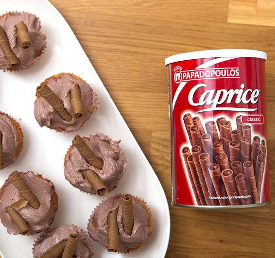 Υλικά Για cupcakes 12 Caprice 120 βούτυρο αγελαδινό, σε θερμοκρασία δωματίου 80 γρ. μαύρη ζάχαρη 45 γρ. καστανή ζάχαρη - Ακτίνα 2 αυγά 1 κ.γ. εκχύλισμα βανίλιας 140 γρ. αλεύρι που φουσκώνει μόνο του - "Το Εκλεκτό" Χαλκιδικής 2 πολύ ώριμες μπανάνες Για το frosting 12 Caprice 1 μπανάνα ½ κούπα βούτυρο αγελαδινό, σε θερμοκρασία δωματίου ½ κούπα κακάο 1 πρέζα αλάτι 4 κούπες άχνη ζάχαρη - "Royal Sugar" 1 κ.γ. εκχύλισμα βανίλια 4 κουταλιές γάλα εβαπορέ Εκτέλεση Βάζουμε στον κάδο του μίξερ τις ζάχαρες και το βούτυρο και χτυπάμε με το σύρμα σε δυνατή ταχύτητα μέχρι να αφρατέψουν. Προσθέτουμε ένα-ένα τα αυγά και χτυπάμε μέχρι να ομογενοποιθούν. Κλείνουμε το μίξερ, βάζουμε το αλεύρι και τη βανίλια στο μείγμα και χτυπάμε στην χαμηλότερη ταχύτητα για 2 - 3'. Προσθέτουμε τις μπανάνες τις οποίες έχουμε λιώσει, κάνουμε ένα τελευταίο ανακάτεμα και κατεβάζουμε τον κάδο. Μοιράζουμε το μισό μείγμα σε 12 μεγάλες χάρτινες θήκες για cupcakes τις οποίες έχουμε τοποθετήσει στην ειδική βάση. Σπάμε 12 Caprice στα 2 και τοποθετούμε από 2 κομμάτια σε κάθε cupcake. Σκεπάζουμε το υπόλοιπο μείγμα. Ψήνουμε σε προθερμασμένο φούρνο στους 170 °C για 20 - 25' στον αέρα. Παράλληλα με το ψήσιμο ετοιμάζουμε το frosting. Βάζουμε στον κάδο του μίξερ το βούτυρο με τη ζάχαρη και χτυπάμε με το σύρμα μέχρι να ασπρίσει και να αφρατέψει. Προσθέτουμε τη βανίλια, το κακάο και το γάλα και χτυπάμε άλλα 2 - 3'. Αφήνουμε τα cupcakes να κρυώσουν τελείως και στολίζουμε με το frosting και τα Caprice. Πηγή: http://www.papadopoulou.gr/