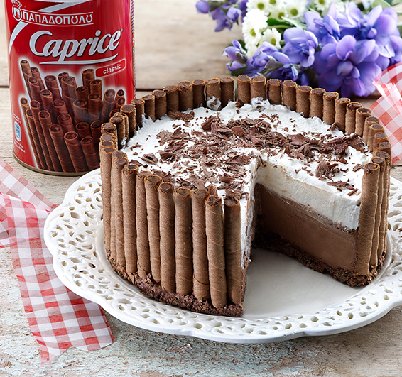 Υλικά 400 γρ./1 κουτί Caprice 60 - 80 γρ. σοκολάτα κουβερτούρα λιωμένη (για τη βάση) Σοκολάτα κουβερτούρα ξύσμα για τη διακόσμηση Για την κρέμα 250 γρ. σοκολάτα κουβερτούρα 400 ml κρέμα γάλακτος Για τη σαντιγί 250 ml κρέμα γάλακτος 125 γρ. ζάχαρη άχνη - "Royal Sugar" Εκτέλεση Παίρνουμε μια φόρμα με αποσπώμενο πάτο ή ένα τσέρκι διαμέτρου 20 - 22 εκατοστών και ύψους 7,5 εκατοστών. Κόβουμε λίγο τις άκρες από τα Caprice και τα τοποθετούμε γύρω γύρω στα τοιχώματα της φόρμας. Θρυμματίζουμε τα υπόλοιπα Caprice και τα αναμειγνύουμε με τη λιωμένη σοκολάτα. Απλώνουμε το μείγμα στον πάτο της φόρμας και το αφήνουμε για λίγο στο ψυγείο ώστε να σταθεροποιηθεί η βάση με τη σοκολάτα. Στη συνέχεια ετοιμάζουμε την κρέμα σοκολάτας. Λιώνουμε την κουβερτούρα σε μπεν μαρί. Χτυπάμε την κρέμα γάλακτος σε αφράτη σαντιγί και την αναμειγνύουμε με τη λιωμένη κουβερτούρα ανακατεύοντας με σπάτουλα. Βάζουμε την κρέμα στη φόρμα και ισιώνουμε την επιφάνειά της με σπάτουλα. Ξαναβάζουμε τη φόρμα στο ψυγείο και την αφήνουμε για τουλάχιστον 1 ώρα μέχρι να σταθεροποιηθεί. Χτυπάμε την κρέμα γάλακτος μαζί με την άχνη σε αφράτη σαντιγί και την απλώνουμε στη φόρμα πάνω από την κρέμα σοκολάτας. Διακοσμούμε με ξύσμα κουβερτούρας και την αφήνουμε στο ψυγείο να παγώσει καλά. Αφήνουμε για λίγα λεπτά εκτός ψυγείου, κόβουμε σε τριγωνικά κομμάτια και σερβίρουμε. Πηγή: http://www.papadopoulou.gr/