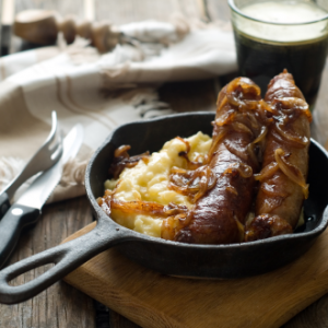 Υλικά 4 λουκάνικα Τρικάλων Υφαντής 200 γρ. κατίκι 50 γρ. γραβιέρα 2 φέτες ψωμί του τοστ 1 σκελίδα σκόρδο 2 Πατάτες 100 ml Ελαιόλαδο Ρίγανη Αλάτι – πιπέρι Εκτέλεση Σχίζουμε κατά μήκος τα λουκάνικα και τα πιέζουμε ελαφρώς ούτως ώστε να ανοίξουν χωρίς να σχιστούν. Σε ένα μπολ ομογενοποιούμε το κατίκι με την γραβιέρα και λίγο αλατοπίπερο. Γεμίζουμε την σχισμή του λουκάνικου με την βοήθεια ενός μικρού κουταλιού. Καθαρίζουμε και τρίβουμε τις πατάτες σε ένα χοντρό τρίφτη. Ξεπλένουμε με νερό το τρίμμα και το τοποθετούμε σε ένα αντικολλητικό ταψάκι (εναλλακτικά τοποθετούμε χαρτί ψησίματος). Καρυκεύουμε με αλάτι, πιπέρι, και ρίγανη, προσθέτουμε αρκετό ελαιόλαδο και ανακατεύουμε. Τοποθετούμε τα γεμιστά λουκάνικα πάνω στο τρίμμα πατάτας. Σε ένα blender ψιλοκόβουμε την σκελίδα του σκόρδου και στην συνέχεια προσθέτουμε την ψίχα από το ψωμί του τοστ και ψιλοκόβουμε. Πασπαλίζουμε με το μείγμα του ψωμιού πάνω από τα λουκάνικα και προσθέτουμε λίγη ρίγανη. Ψήνουμε σε προθερμασμένο φούρνο στους 220 °C έως ότου πάρουν τα λουκάνικα ένα όμορφο χρώμα περίπου 12'. Πηγή: https://www.ifantis.gr