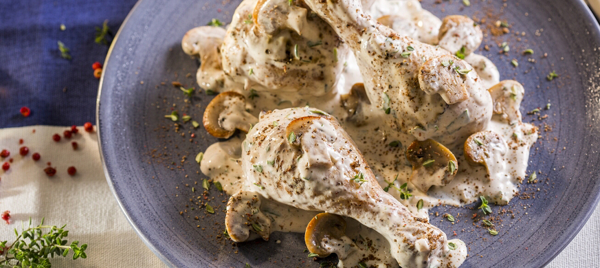 Υλικά Για τα μπουτάκια 2 κ.σ. ελαιόλαδο 6 μπουτάκια κοτόπουλο (κοπανάκι) 1 κούπα ζωμό κότας Αλάτι – πιπέρι Για τη σάλτσα 200 ml κρέμα γάλακτος Adoro per pasta 2 κ.σ. βούτυρο 1 κρεμμύδι κομμένο σε λεπτές φέτες 1 σκελίδα σκόρδο λιωμένη 250 γρ. μανιτάρια άσπρα κομμένα σε λεπτές φέτες 2 κ.σ. ξίδι λευκό βαλσαμικό ¼ κ.γ. μοσχοκάρυδο τριμμένο 2 κ.σ. θυμάρι φρέσκο ψιλοκομμένο 2 κ.σ. μαϊντανό φρέσκο ψιλοκομμένο Αλάτι – πιπέρι Εκτέλεση Μπουτάκια Πασπαλίζουμε με αλάτι, πιπέρι τα μπουτάκια και τα κρατάμε στην άκρη. Ζεσταίνουμε το ελαιόλαδο σε μία κατσαρόλα και σοτάρουμε πολύ καλά τα μπουτάκια για 5' περίπου από κάθε πλευρά, μέχρι να πάρουν χρώμα. Προσθέτουμε το ζωμό και τα αφήνουμε να βράσουν για 20'. Βγάζουμε τα μπουτάκια από το ζωμό και τα κρατάμε και τα δυο στην άκρη. Σάλτσα Προσθέτουμε το βούτυρο σε ένα τηγάνι, αφήνουμε να λιώσει και στη συνέχεια προσθέτουμε το κρεμμύδι, το σκόρδο, τα μανιτάρια και τα αφήνουμε να σοταριστούν για 3 - 4', μέχρι να πάρουν χρώμα και να μαραθούν. Σβήνουμε τα μανιτάρια με το ξίδι, προσθέτουμε το μοσχοκάρυδο, αλάτι, πιπέρι και το ζωμό από τα κοτόπουλα. Αφήνουμε να βράσουν σε μέτρια θερμοκρασία για 5 - 6', μέχρι να μειωθούν ελαφρώς τα υγρά. Προσθέτουμε το κοτόπουλο, την κρέμα γάλακτος, τα αρωματικά και τα αφήνουμε πάνω στη φωτιά για 5', αναταράσσοντας το τηγάνι, έτσι ώστε να αγκαλιαστούν τα υλικά μεταξύ τους και να δέσει η σάλτσα. Πηγή: https://www.adorocreams.gr/