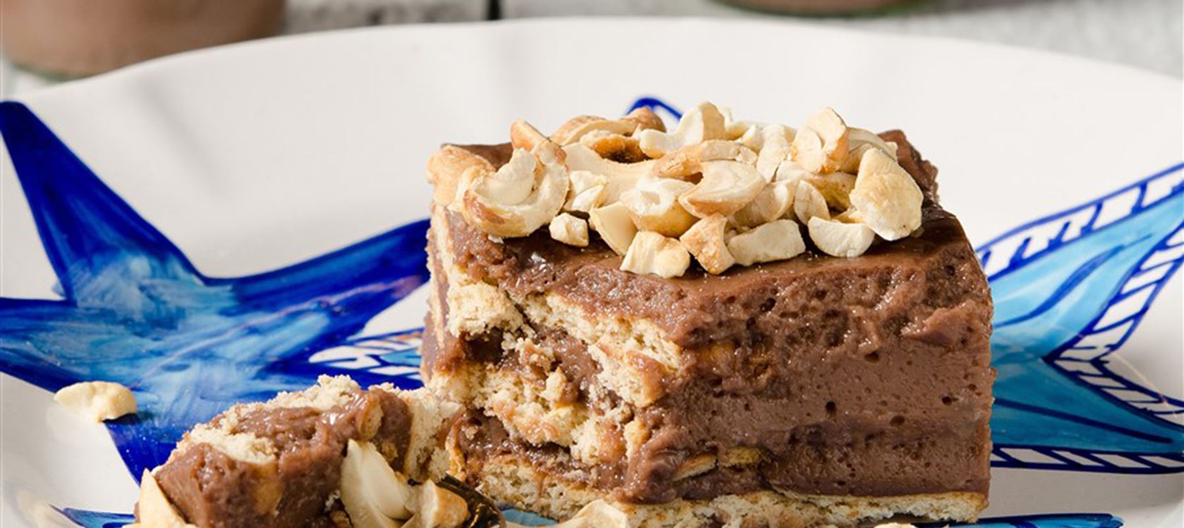 Υλικά 1 λίτρο σοκολατούχο ρόφημα γάλακτος Arla Protein 200 γρ. σοκολατούχο ρόφημα γάλακτος Arla Protein, χλιαρό 1 πακέτο + 4 κομμάτια μπισκότο τύπου πτι-μπερολικής άλεσης 50 γρ. καστανή ζάχαρη ή 100 γρ. μέλι 80 γρ. αλεύρι corn flour 130 γρ. φυστίκια κάσιους ανάλατα, ελαφρώς καβουρδισμένα στον φούρνο Εκτέλεση Εκτέλεση για τη σοκολατένια τούρτα Σε μία κατσαρόλα αδειάζουμε τα 800 ml από το ένα 1 λίτρο Αrla Protein Milk Drink μαζί με τη ζάχαρη ή το μέλι και το τοποθετούμε στη φωτιά. Σε ένα μπoλ αδειάζουμε τα υπόλοιπα 200 γρ. από το λίτρο και το κορν φλάουρ και ανακατεύουμε. Ανακατεύουμε το γάλα συνεχώς και πριν πάρει βράσει προσθέτουμε το κρύο γάλα με το κορν φλάουρ και συνεχίζουμε το ανακάτεμα έως ότου η κρέμα βράσει και δέσει. Αποσύρουμε από τη φωτιά. Σε ένα τετράγωνο ταψάκι ή τσέρκι 20x20 στρώνουμε μία στρώση από τα μπισκότα που τα έχουμε βουτήξει για δευτερόλεπτα στο χλιαρό Αrla Protein Milk Drink. Συνεχίζουμε τη διαδικασία έως ότου τελειώσουν τα μπισκότα και τελειώνουμε με κρέμα. Βάζουμε στο ψυγείο για 2 - 3 ώρες. Ξεφορμάρουμε και γαρνίρουμε με χοντροκομμένα κάσιους. Πηγή: https://www.arlafoods.gr/