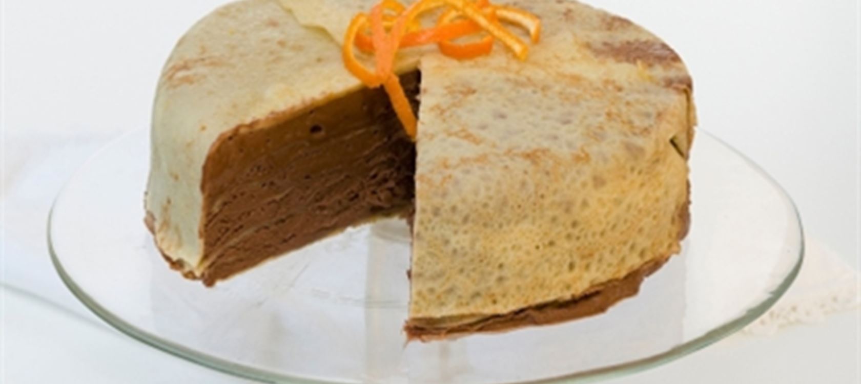 Υλικά Για τις κρέπες 90 γρ. αλεύρι κοσκινισμένο 20 γρ. ζάχαρη κρυσταλλική 1 πρέζα αλάτι 2 αυγά 1 κρόκος αυγού 30 γρ. βούτυρο Lurpak λιωμένο 240 γρ. γάλα ζεστό Ξύσμα από 1 πορτοκάλι Για τη σοκολάτα 300 γρ. κουβερτούρα (55% κακάο) 300 γρ. κρέμα γάλακτος 36% λιπαρά “Arla” χτυπημένη σε παχύρρευστη μορφή 150 γρ. γάλα Εκτέλεση Ανακατεύουμε το αλεύρι, τη ζάχαρη, το αλάτι και το ξύσμα. Ρίχνουμε τα αυγά και τον κρόκο και ανακατεύουμε έως ότου γίνει ένας χυλός. Προσθέτουμε σιγά-σιγά το γάλα ανακατεύοντας. Ρίχνουμε το λιωμένο βούτυρο Lurpak και ανακατεύουμε. Αφήνουμε το μείγμα για 15' να ξεκουραστεί. Βουτυρώνουμε ένα αντικολλητικό τηγάνι διαμέτρου 18 εκατοστών και το τοποθετούμε στη φωτιά έως ότου κάψει αρκετά. Ρίχνουμε μία κουταλιά από το χυλό και με γρήγορες κινήσεις του τηγανιού απλώνουμε το μείγμα παντού. Αναποδογυρίζουμε μία σπάτουλα την κρέπα για να ψηθεί και από την άλλη πλευρά. Τις τοποθετούμε πάνω σε μία λαδόκολλα. Σοκολάτα Τεμαχίζουμε την κουβερτούρα σε πολύ μικρά κομμάτια. Βράζουμε το γάλα και το αδειάζουμε πάνω από αυτήν. Ομογενοποιούμε πολύ καλά και προσθέτουμε την παχύρρευστη κρέμα ανακατεύοντας απαλά με μία μαρίζ. Συναρμολόγηση Σε στρογγυλή φόρμα ή τσέρκι διαμέτρου 20-22 εκατοστών απλώνουμε τις κρέπες έτσι ώστε να εξέχουν από τα τοιχώματα. Γεμίζουμε με λίγη από την κρέμα σοκολάτα και καλύπτουμε εναλλάξ με κρέπα και κρέμα. Στο τέλος διπλώνουμε τις άκρες της πρώτης κρέπας προς τα μέσα. Αφήνουμε στο ψυγείο για 3 ώρες περίπου και ξεφορμάρουμε Πηγή: https://www.arlafoods.gr
