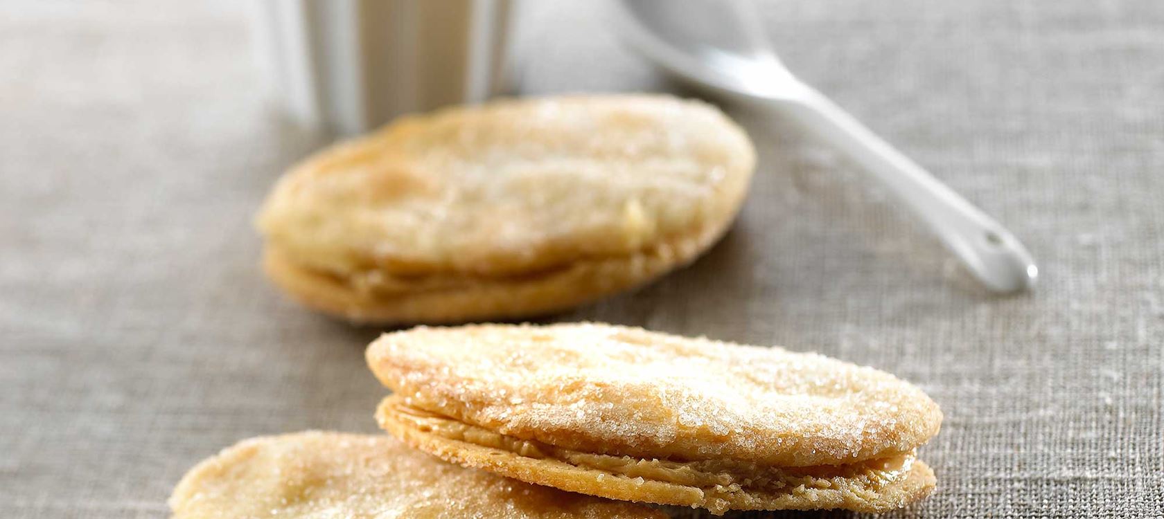 Υλικά 150 γρ. βούτυρο Lurpak ανάλατο 150 γρ. αλεύρι 4 κ.σ. ζάχαρη 1 ασπράδι μεσαίου αυγού 1 κρέμα Μόκα 1 κ.γ. στιγμιαίο καφέ 1 κ.σ. βραστό νερό 100 γρ. βούτυρο Lurpak Soft ανάλατο 75 γρ. γλάσο ζάχαρης 1 κρόκος μεσαίου αυγού 1 κ.γ. τριμμένη φλούδα πορτοκαλιού Εκτέλεση Κόβετε το βούτυρο Lurpak σε μικρά κομμάτια και ανακατεύετε με το αλεύρι. Δένετε γρήγορα τη ζύμη και την αφήνετε καλυμμένη στο ψυγείο για 30' περίπου. Ζυμώνετε τη ζύμη σε λεπτά ρολά επάνω σε αλευρωμένη επιφάνεια. Κόβετε 32 βάσεις ζύμης χρησιμοποιώντας στρογγυλό κόφτη διαμέτρου περίπου 6 εκατοστών. Πασπαλίστε τη ζάχαρη σε λαδόκολλα. Αλείφετε τις βάσεις με ασπράδι αυγού και τις τοποθετείτε με την αλειμμένη πλευρά επάνω στη ζάχαρη. Πλάθετε ελαφρά με έναν πλάστη για να τους δώσετε οβάλ σχήμα. Τις τοποθετείτε σε λαδόκολλα με την ζαχαρωμένη επιφάνεια προς τα επάνω και τις ψήνετε στην επάνω σχάρα του φούρνου μέχρι να πάρουν ένα ελαφρύ χρυσό χρώμα, περίπου 6' στους 200 °C. Τις αφήνετε να κρυώσουν. Κρέμα μόκα Λιώνετε τον στιγμιαίο καφέ στο βραστό νερό και έπειτα αφήστε τον να κρυώσει. Χτυπάτε το βούτυρο, το γλάσο ζάχαρης και τον κρόκο του αυγού με ένα μίξερ χειρός μέχρι το μείγμα να γίνει ελαφρύ και αφράτο. Προσθέστε τον καφέ στην κρέμα και προσθέστε για γεύση την τριμμένη φλούδα πορτοκαλιού. Ενώστε τις βάσεις ανά δύο τοποθετώντας ενδιάμεσα την κρέμα με την ζαχαρωμένη πλευρά προς τα επάνω. Σερβίρετε τις βάφλες ελαφρώς παγωμένες. Πηγή: https://www.arlafoods.gr