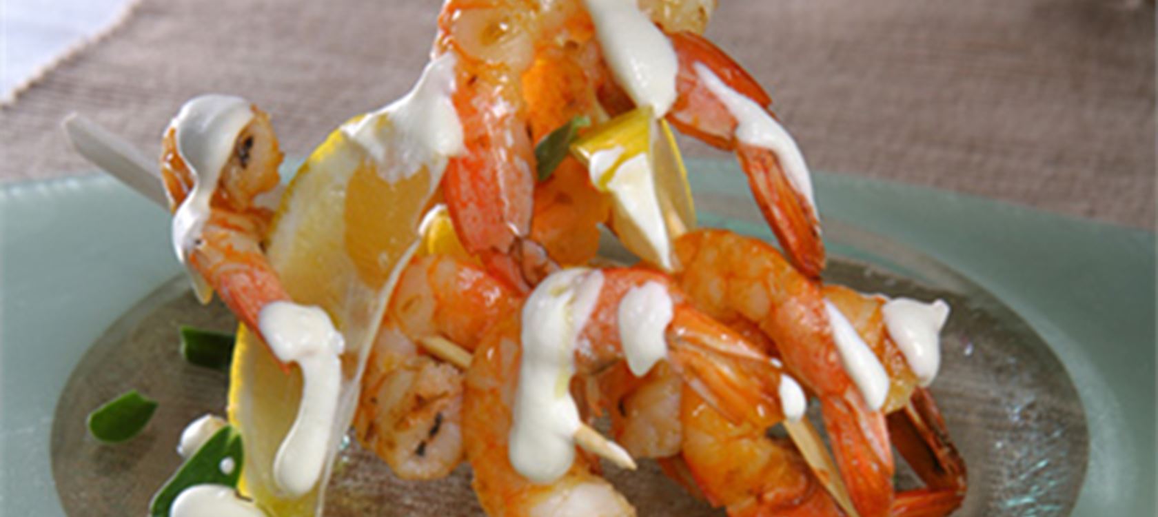 Υλικά 24 γαρίδες μεσαίου μεγέθους καθαρισμένες 1 φλιτζάνι ελαιόλαδο χυμό απο 2 λεμόνια σκόνη σκόρδο ρίγανη 1 κουταλιά μέλι αλάτι φρεσκοτριμμένο πιπέρι 1 λεμόνι κομμένο σε 8 κομμάτια 8 ξύλινα καλαμάκια για σουβλάκια 100 ml κρέμα γάλακτος Arla Εκτέλεση Αφού έχετε καθαρίσει καλά τις γαρίδες παίρνετε ένα μεγάλο μπολ και ανακατεύετε καλά το χυμό λεμονιού μαζί με το μέλι και στην συνέχεια προσθέτετε το ελαιόλαδο το σκόρδο και την ρίγανη. Προσθέτετε αλάτι και φρεσκοτριμμένο πιπέρι καθώς και τις καθαρισμένες γαρίδες και τις αφήνετε να μαριναριστούν για 1 ολόκληρη ώρα. Αφού περάσει η μια ώρα βγάζετε τις γαρίδες από το μπολ και τις στραγγίζετε καλά. Τις περνάτε στα ξύλινα σουβλάκια (3 σε κάθε καλαμάκι και δύο καλαμάκια κατά άτομο) και βάζετε και από 2 φέτες λεμόνι. Τις ψήνετε σε ένα ραβδωτό τηγάνι και από τις δύο μεριές. Όταν είναι έτοιμες αφαιρείτε τα καλαμάκια από το τηγάνι και σβήνετε με την κρέμα γάλακτος. Ανακατεύετε έτσι ώστε να πάρει όλη την γεύση και σερβίρετε τα καλαμάκια περιχύνοντας τα με την κρέμα από το τηγάνι και τις σερβίρετε σαν πρώτο πιάτο. Εάν θέλετε μπορείτε να συνοδεύσετε με μια πράσινη δροσερή σαλάτα. Πηγή: https://www.arlafoods.gr