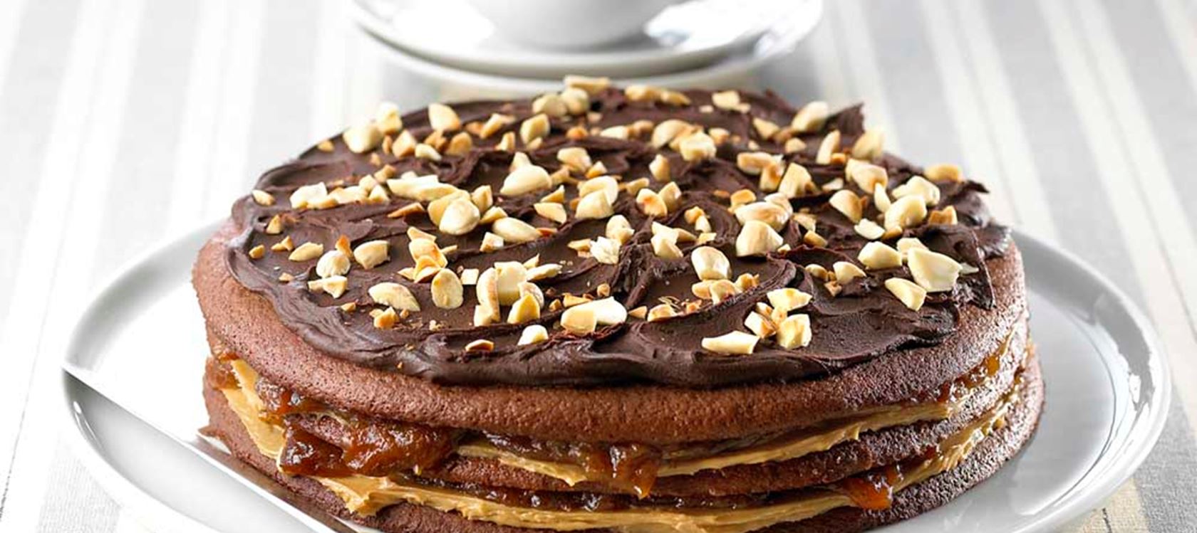 Υλικά Κρέμα βουτύρου μόκας 1 κρέμα βουτύρου Μόκας 100 γρ. ανάλατο Lurpak Soft 75 γρ. ζάχαρη άχνη κ.γ. στιγμιαίο καφέ 2 κ.γ. βρασμένο νερό Βρασμένα βερίκοκα 200 γρ. ξηρά βερύκοκα χωρίς το κουκούτσι και αποφλοιωμένα 250 γρ. νερό 1 κ.σ. ζάχαρη 3 κ.σ. φρέσκο χυμό λεμονιού 3 έτοιμες βάσεις κέικ με κακάο (διαμέτρου 21 εκ. περίπου) 2 κ.σ. φρέσκο χυμό πορτοκάλι 100 γρ. μαύρη σοκολάτα 2 κ.σ. γάλα 50 γρ. καβουρδισμένα αμύγδαλα ψιλοκομμένα Εκτέλεση Χτυπάμε στο μίξερ το Lurpak και την ζάχαρη άχνη. Διαλύουμε τον στιγμιαίο καφέ σε βραστό νερό, το ρίχνουμε στο μίξερ και χτυπάμε. Κόβουμε τα βερίκοκα σε λεπτές λωρίδες. Τα βράζουμε σκεπασμένα σε χαμηλή φωτιά για περίπου 5'. Προσθέτουμε τη ζάχαρη και τα σιγοβράζουμε για άλλα 10'. Τα βγάζουμε από τη φωτιά και τα πολτοποιούμε ελαφρά με ένα κουτάλι. Προσθέτουμε το χυμό λεμονιού και τα αφήνουμε να κρυώσουν. Ποτίζουμε την πρώτη βάση με μια κουταλιά της σούπας χυμό λεμονιού. Απλώνουμε τη μισή κρέμα βουτύρου μόκας στη βάση και από τη μισή δόση από τα βερίκοκα. Βάζουμε τη δεύτερη βάση και επαναλαμβάνουμε. Τέλος απλώνουμε την τελευταία βάση. Λιώνουμε τη σοκολάτα και ανακατεύουμε με το γάλα. Απλώνουμε τη σοκολάτα πάνω από τη τελευταία βάση και πασπαλίζουμε με τα αμύγδαλα. Αφήνουμε το κέικ σκεπασμένο στο ψυγείο για περίπου 30'. Πηγή: https://www.arlafoods.gr