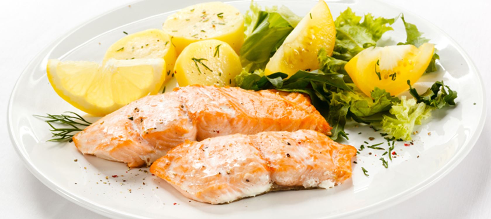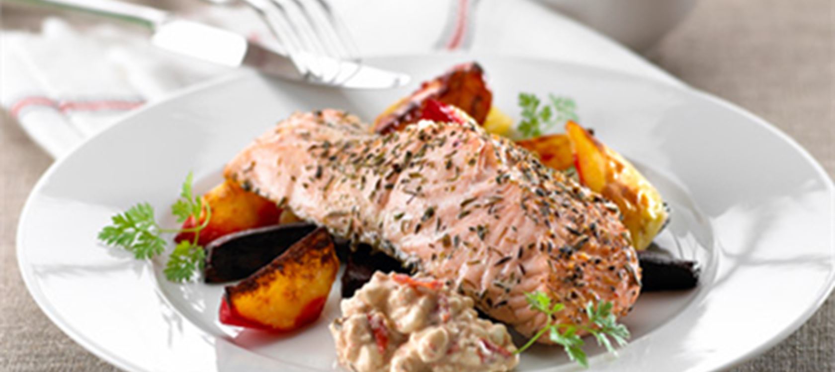 Υλικά 800 γρ. καθαρισμένα παντζάρια και οριζοντίως κομμένα 600 γρ. καθαρισμένες πατάτες οριζοντίως κομμένες 25 γρ. Lurpak Lighter Soft, λιωμένο 1 κουταλάκι του γλυκου χοντρό αλάτι 500 γρ. σολομού φιλέτο, χωρίς πέτσα κουταλάκι του γλυκού herbes de province (γαλλικό μείγμα μπαχαρικών) 200 γρ. Arla Fioccolat Cottage Cheese Εκτέλεση Αναμιγνύουμε τα παντζάρια και τις πατάτες με το Lurpak Lighter Soft σε ένα ταψί με χαρτί φούρνου και αλατίζουμε. Ψήνουμε τα παντζάρια και τις πατάτες στη μέση του φούρνου για περίπου 15'. Συγχρόνως αφαιρούμε τυχόν κόκαλα από το σολομό και τον κόβουμε σε 4 ίσια κομμάτια. Στη συνέχεια τα τοποθετούμε σε ένα βουτυρωμένο ταψί. Βάζουμε τα μπαχαρικά στο σολομό και τον ψήνουμε στη σχάρα πάνω από τα λαχανικά – τα τελευταία 15' (περίπου ½ ώρα συνολικά). Σερβίρουμε το ζεστό σολομό με κρύο Arla Fioccolat Cottage Cheese και τα ψητά λαχανικά. Χρόνος ψησίματος: περίπου ½ ώρα στους 225 °C. Πηγή: https://www.arlafoods.gr