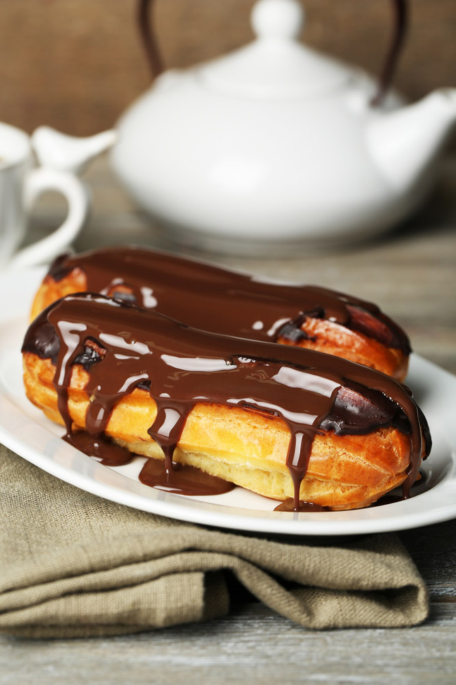 Υλικά ½ φλιτζάνι νερό ½ φλιτζάνι γάλα πλήρες ½ φλιτζάνι βούτυρο κομμένο σε κομμάτια 2 κ.γ. ζάχαρη 1 κ.γ. αλάτι 1 φλιτζάνι αλεύρι κοσκινισμένο 4 μεγάλα αυγά Για την κρέμα 2 φλιτζάνια γάλα πλήρες ½ φλιτζάνι ζάχαρη 5 κρόκοι αυγών 2 κ.σ. αλεύρι 4 κ.σ. άμυλο καλαμποκιού 1 κ.γ. απόσταγμα βανίλιας 2 κ.σ. βούτυρο Για το γαρνίρισμα με σοκολάτα ¼ του φλιτζανιού κρέμα γάλακτος 115 γρ. σοκολάτα ΙΟΝ κουβερτούρα 1 κ.σ. βούτυρο Εκτέλεση Προθερμαίνουμε τον φούρνο στους 220 °C και καλύπτουμε με χαρτί ψησίματος ένα μεγάλο ρηχό ταψί. Βάζουμε το νερό, το γάλα, το βούτυρο και το αλάτι σε μια μικρή κατσαρόλα και τα αφήνουμε να πάρουν βράση σε μέτρια προς δυνατή φωτιά. Αμέσως μετά τα βγάζουμε από τη φωτιά, ρίχνουμε το κοσκινισμένο αλεύρι και ανακατεύουμε με μια ξύλινη κουτάλα έτσι ώστε το αλεύρι να γίνει ένα με τα υπόλοιπα συστατικά. Βάζουμε πάλι πίσω στη φωτιά την κατσαρόλα και ανακατεύουμε πολύ καλά τη ζύμη μέχρι να μην κολλάει στα πλαϊνά του σκεύους αλλά ούτε και στην κουτάλα μας. Βγάζουμε με το κουτάλι τη ζύμη σε ένα μπολ, προσθέτουμε τα αυγά, ένα τη φορά, ανακατεύοντας συνεχώς μέχρι η ζύμη να γίνει γυαλιστερή και απαλή. Γεμίζουμε ένα κορνέ ζαχαροπλαστικής που να έχει στην άκρη μια μύτη με μεγάλο άνοιγμα και βγάζουμε 8 κομμάτια μήκους 12 περίπου εκατοστών πάνω στο χαρτί ψησίματος. Ψήνουμε για 15' περίπου, μετά μειώνουμε τη θερμοκρασία στους 190 °C, αφήνουμε την πόρτα του φούρνου λίγο ανοιχτή και ψήνουμε για 25' ακόμη μέχρι οι ζύμες να χρυσίσουν. Βγάζουμε το ταψί και αφήνουμε να κρυώσουν εντελώς οι ζύμες. Κρέμα Ενώ τα εκλέρ ψήνονται, ρίχνουμε 2 φλιτζάνια γάλα σε ένα κατσαρολάκι και τα αφήνουμε να πάρει μια βράση σε μέτρια φωτιά. Μόλις αυτό γίνει το βγάζουμε από τη φωτιά. Σε ένα μπολ χτυπάμε τη ζάχαρη με τους κρόκους των αβγών μέχρι το μείγμα να γίνει άσπρο και αφράτο. Προσθέτουμε το αλεύρι και το άμυλο καλαμποκιού και ανακατεύουμε πολύ καλά μέχρι να δέσουν όλα τα συστατικά και να γίνουν ένα. Ρίχνουμε 1/3 από το ζεστό γάλα στο μείγμα με τους κρόκους χτυπώντας συνεχώς καθώς το χύνουμε. Ρίχνουμε το υπόλοιπο γάλα και χτυπάμε. Μετά ρίχνουμε όλο το περιεχόμενο πίσω στο κατσαρολάκι και μαγειρεύουμε σε μέτρια προς δυνατή φωτιά, χτυπώντας συνεχώς μέχρι να πήξει και να αρχίσει να βράζει. Βάζουμε τη βανίλια και το βούτυρο, ανακατεύουμε και αφήνουμε να κρυώσει. Γαρνίρισμα σοκολάτας Βάζουμε την κρέμα γάλακτος, τη σοκολάτα και το βούτυρο σε μπεν μαρί και τα λιώνουμε σιγά-σιγά. Βάζουμε σε ένα κορνέ ζαχαροπλαστικής την κρέμα για τα εκλέρ και χρησιμοποιούμε μια μεσαία προς μικρή μύτη για να γεμίσουμε τα εκλέρ. Μπορούμε να τα γεμίσουμε από την βάση τους κάνοντας δυο τρύπες ή να τα κόψουμε στη μέση. Μην τα παραγεμίσετε! Βουτήξτε το πάνω μέρος των εκλέρ στην λιωμένη σοκολάτα ενώ είναι ακόμα ζεστή και μετά βάλτε τα εκλέρ σας στο ψυγείο για μια ώρα να κρυώσουν. Πηγή: https://www.ionsweets.gr/