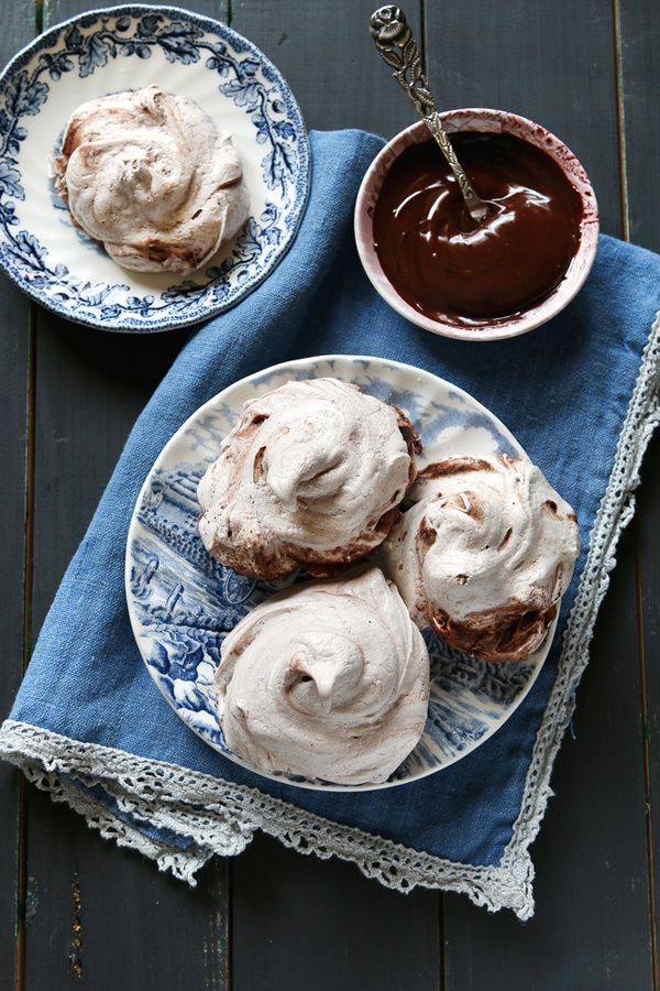 Υλικά 2 ασπράδια από μεγάλα αυγά σε θερμοκρασία δωματίου 1 κ.γ. απόσταγμα βανίλιας 1 κ.γ. στιγμιαίο καφέ εσπρέσο ¼ κ.γ. χοντρό αλάτι ½ φλιτζάνι ζάχαρη 115 γρ. κουβερτούρα ΙΟΝ λιωμένη Εκτέλεση Προθερμαίνουμε τον φούρνο στους 100 °C. Με ένα μίξερ χτυπάμε τα ασπράδια από τα αυγά, την βανίλια, τον καφέ και το αλάτι σε μέτρια ταχύτητα μέχρι να σχηματιστούν κορφές στο μείγμα. Σιγά-σιγά, ρίχνοντας μια κουταλιά τη φορά, χτυπάμε τη ζάχαρη. Ανεβάζουμε την ταχύτητα του μίξερ στην πιο υψηλή και χτυπάμε μέχρι το μείγμα μας να γίνει γυαλιστερό. Βάζουμε χαρτί ψησίματος σε ένα μεγάλο ρηχό ταψί και με ένα κουτάλι αφήνουμε στην επιφάνεια του χαρτιού γεμάτες κουταλιές που να βρίσκονται σε απόσταση 2 εκατοστών περίπου η μια από την άλλη. Ψήνουμε για περίπου 2 ώρες μέχρι οι μαρέγκες να γίνουν τραγανές και σφιχτές. Σβήνουμε τον φούρνο και μετά ανοίγουμε την πόρτα του βάζοντας τη λαβή μιας ξύλινης κουτάλας για να μην κλείσει. Αφήνουμε τις μαρέγκες για μια ώρα μέσα στο φούρνο. Βγάζουμε τις μαρέγκες και τις αφήνουμε να κρυώσουν. Βουτάμε το κάτω μέρος από τις μαρέγκες στην λιωμένη σοκολάτα και ύστερα τις βάζουμε στο ψυγείο για 25 - 30' να κρυώσουν. Πηγή: https://www.ionsweets.gr/