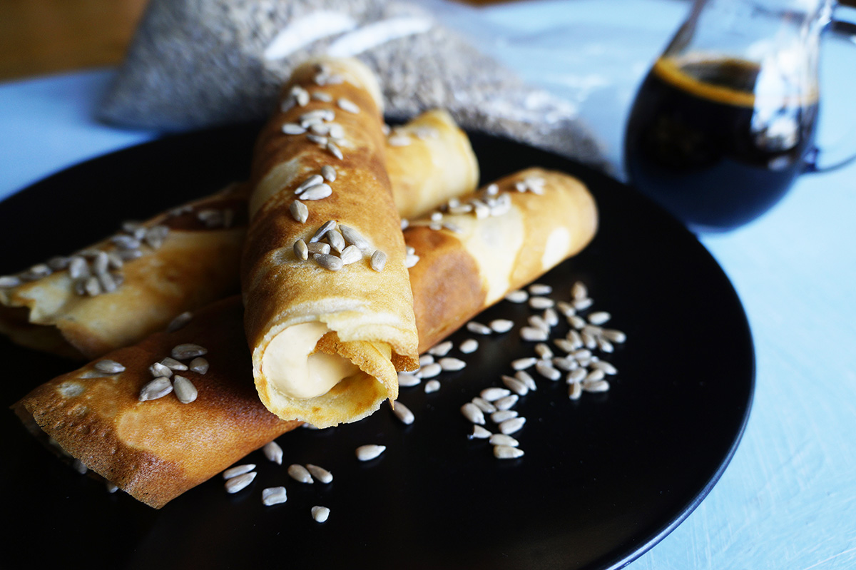Υλικά Για τη ζύμη 120 γρ. αλεύρι για όλες τις χρήσεις 2 αυγά 350 ml φρέσκο γάλα 20 γρ. ζάχαρη 3 κ.σ. ταχίνι 40 γρ. βούτυρο Για την κρέμα πετιμέζι 400 ml κρέμα γάλακτος 120 ml πετιμέζι 120 γρ. ηλιόσποροι ψίχα Εκτέλεση Ζύμη Σε ένα μεγάλο μπολ χτυπάτε με το μίξερ το βούτυρο, τα αυγά, τη ζάχαρη μέχρι το μείγμα να ομογενοποιηθεί. Προσθέτετε το γάλα και συνεχίζεται το χτύπημα. Κατόπιν ρίχνετε λίγο-λίγο το αλεύρι και συνεχίζετε μέχρι το μείγμα να γίνει ένας σφιχτός χυλός. Βάζετε το μείγμα στο ψυγείο για 15'. Αλείφετε με λίγο βούτυρο ένα αντικολλητικό τηγάνι διαμέτρου 26 εκατοστών και αφού ζεσταθεί σε χαμηλή φωτιά, ρίχνετε μια κουταλιά από το χυλό. Όταν η κρέπα αρχίσει να κάνει φουσκάλες, αναποδογυρίστε τη προσεκτικά και την αφήνετε να ψηθεί. Επαναλαμβάνετε το ίδιο και για τις υπόλοιπες 5 κρέπες. Κρέμα πετιμέζι Σε ένα μπολ ρίχνετε την κρέμα γάλακτος και χτυπάτε με το μίξερ για να γίνει σαντιγί. Κατά τη διάρκεια ρίχνετε σταδιακά το πετιμέζι. Αφού ολοκληρώσετε προσθέστε την ψίχα ηλιόσπορου και ανακατέψτε απαλά. Τέλος απλώστε σε κάθε κρέπα την κρέμα και τυλίξτε σε ρολό. Γαρνίρετε με ψίχα ηλιόσπορου. Πηγή: https://www.ionsweets.gr/