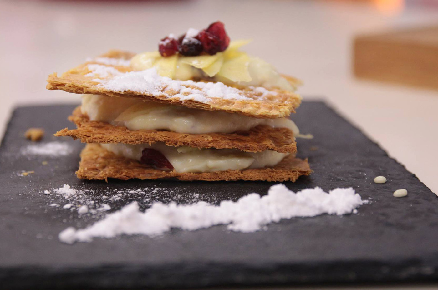 Υλικά Για την κρεμά μας 300 γρ. κουβερτούρα λευκή ΙΟΝ 200 ml. κρέμα γάλακτος ¾ από ένα μάνγκο Για την σφολιάτα μας 1 φύλλο σφολιάτας 1 αυγό 15 ml. νερό 40 γρ. μαύρη ζάχαρη Για το γαρνίρισμα 100 γρ. Cranberry ¼ από το υπόλοιπο μάνγκο 30 γρ. άχνη ζάχαρη 10 φύλλα δυόσμου Εκτέλεση Βάζουμε το φύλλο σφολιάτας σε ένα ταψί με μια λαδόκολλα και το περνάμε με να πινέλο και από τις δυο πλευρές με το αυγό και το νερό αφού πρώτα το έχουμε ανακατέψει,στην συνέχεια ρίχνουμε και από τις δυο πλευρές μαύρη ζάχαρη, τρυπάμε το φύλλο με ένα πιρούνι σε όλα τα σημεία και το βάζουμε στο φούρνο για 25' στους 180 °C. Χτυπάμε τα 150 ml κρέμα γάλακτος μέχρι να γίνει ελαφριά σαντιγί. Λιώνουμε την λευκή κουβερτούρα της ΙΟΝ σε ένα μπεν μαρι. Καθαρίζουμε το μάνγκο χρησιμοποιώντας τα ¾ και το πολτοποιούμε μαζί με τα 50ml κρέμας γάλακτος. Κάνουμε ένα την σαντιγί με την σοκολάτα και τον πολτό από το μάνγκο και βάζουμε στο ψυγείο για 30 λεπτά. Σπάμε την σφολιάτα με το χέρι σε πολλά κομμάτια αφού κρυώσει. Γαρνίρουμε σε ένα ποτήρι βάζοντας πρώτα σφολιάτα μετά την κρέμα μετά τα cranberry και επαναλαμβάνουμε 2 φορές. Στην τελευταία στρώση με σφολιάτα βάζουμε άχνη ζάχαρη φύλλα δυόσμου και cranberry. Πηγή: https://www.ionsweets.gr/