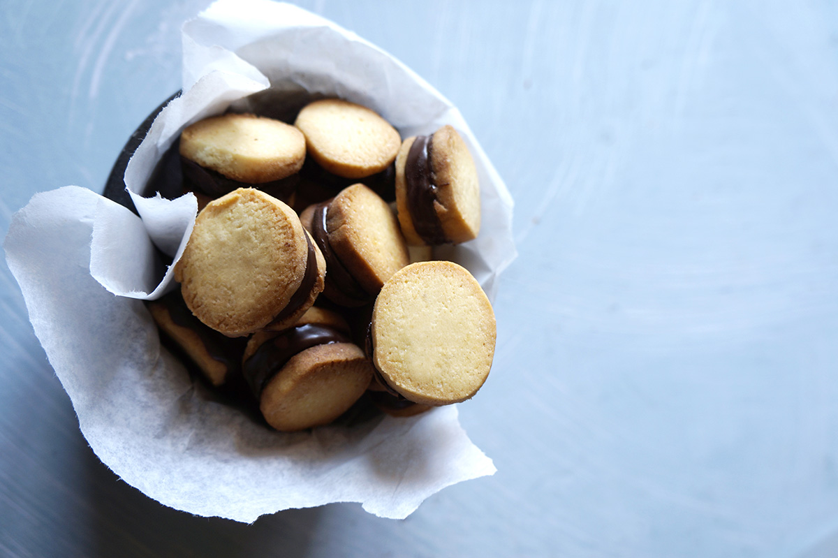Υλικά Για το μπισκότο 225 γρ. βούτυρο 225 γρ. ζάχαρη 520 γρ. αλέυρι για όλες τις χρήσεις 1 κ.γ. baking powder 1 βανίλια 2 αυγά Για τη γέμιση 4 μπανάνες 2 κουβέρτούρες ΙΟΝ κλασσική Εκτέλεση Μπισκότο Σε ένα μπολ ρίχνετε τα αυγά, τη ζάχαρη, το baking powder και τη βανίλια και χτυπάτε δυνατά με το σύρμα μέχρι να αφρατέψει το μείγμα. Στη συνέχεια συμπληρώνετε το αλεύρι αφού το έχετε κοσκινίσει και δουλεύετε απαλά το μείγμα με τα χέρια σας μέχρι να ομογενοποιηθεί το μείγμα. Χωρίζετε τη ζύμη σε 4 ίσα μέρη. Τυλίγετε κυλινδρικά τις ζύμες σας μέσα σε λαδόχαρτο σε μέγεθος μιας μπανάνας και αφήνετε στην κατάψυξη για 10'. Αφού παγώσουν βγάζετε από την κατάψυξη τα μπαστούνια ζύμης και τα κόβετε σε φέτες πάχους 1 εκατοστού και τα τοποθετείτε σε ένα ταψί στο οποίο έχετε τοποθετήσει λαδόκολλα. Ψήνετε σε προθερμασμένο φούρνο στους 170 °C για 10'. Γέμιση Σε ένα μπεν μαρί λιώνετε την κουβερτούρα και αφού καθαρίσετε και κόψετε τις μπανάνες σε φέτες πάχους 1 εκατοστού , τις βουτάτε μέσα στην λιωμένη κουβερτούρα. Στη συνέχεια τοποθετείτε τις γλασσαρισμένες μπανάνες μία μία πάνω σε κάθε μπισκότο και σκεπάζετε με ένα δεύτερο μπισκότο από πάνω. Συνεχίζετε μέχρι να τελειώσουν τα υλικά. Τους καλοκαιρινούς μήνες διατηρείστε τα μπισκότα σας στο ψυγείο. Η ζύμη μπορεί να διατηρηθεί στην κατάψυξη ένα μήνα και να φτιάξετε τα μπισκότα όποτε επιθυμείτε. Πηγή: https://www.ionsweets.gr/