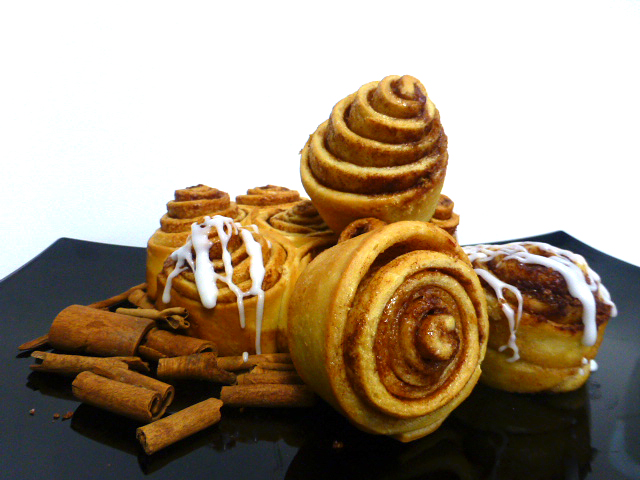 Υλικά Για τη ζύμη 175 γρ. αλεύρι μαλακό 150 γρ. αλεύρι σκληρό 4 γρ. ξηρή μαγιά 120 γρ. γάλα 40 γρ. βούτυρο 35 γρ. ζάχαρη λευκή κρυσταλλική 1 γρ. αλάτι 90 γρ. αυγά Για τη γέμιση 120 γρ. καστανή ζάχαρη 100 γρ. αλεύρι μαλακό 7 γρ. κανέλα σκόνη 75 γρ. βούτυρο (κομμένο σε κύβους) Για το γλάσο (προαιρετικά) 50 γρ. ζάχαρη άχνη κοσκινισμένη 10 γρ. νερό Εκτέλεση Τοποθετούμε το μαλακό αλεύρι, το σκληρό αλεύρι και τη ξηρή μαγιά μέσα σε μια λεκάνη και τα ανακατεύουμε όλα μαζί πολύ καλά. Μέσα σε μια κατσαρόλα ρίχνουμε το γάλα, το βούτυρο, τη κρυσταλλική λευκή ζάχαρη και το αλάτι και τα ζεσταίνουμε ανακατεύοντας με ένα σύρμα μέχρι να ζεσταθούν, περίπου στους 60 °C. Ρίχνουμε το χλιαρό μείγμα μέσα στη λεκάνη με τα άλευρα και τη ξηρή μαγιά και αρχίζουμε να πλάθουμε τη ζύμη. Μόλις αρχίζει να αποκτάει σώμα προσθέτουμε και τα αυγά και συνεχίζουμε το ανακάτεμα μέχρι να γίνει μια λεία ζύμη, για 5' περίπου, και σχηματοποιούμε σε μπάλα. Σκεπάζουμε τη ζύμη μέσα στη λεκάνη με μια μεμβράνη και την αφήνουμε να φουσκώσει στο διπλάσιο του αρχικού της όγκου. Ανακατεύουμε μέσα σε μια λεκάνη τη καστανή ζάχαρη, το μαλακό αλεύρι, και τη κανέλα σκόνη με το χέρι και προσθέτουμε και το βούτυρο. Συνεχίζουμε το ανακάτεμα μέχρι να ενσωματωθούν όλα τα υλικά πολύ καλά μεταξύ τους. Ανοίγουμε τη φουσκωμένη ζύμη με ένα πλάστη σε σχήμα ορθογώνιο παραλληλόγραμμο και σε πάχος 1 εκατοστό περίπου. Απλώνουμε τη γέμιση σε όλη την επιφάνεια της ζύμης αφήνοντας περίπου 1 εκατοστό από όλες τις άκρες της χωρίς γέμιση. Βρέχουμε όλες τις άκρες με ένα πινέλο με νερό. Διπλώνουμε από τη πλευρά που είναι πιο μακριά, δηλαδή κατά μήκος, σε ρολό. Κόβουμε εγκάρσια και σε πάχος 2 εκατοστά περίπου σε μερίδες και τοποθετούμε σε καλά βουτυρωμένο ταψάκι φούρνου το ένα δίπλα στο άλλο. Σκεπάζουμε με μια νοτισμένη πετσέτα μέχρι να διπλασιαστούν σε όγκο και περνάμε την επιφάνεια απαλά με ένα πινέλο με λίγη κρέμα γάλακτος. Ψήνουμε σε προθερμασμένο φούρνο στους 180 °C για 25' περίπου. Με την έξοδο από το φούρνο ξαναπερνάμε με ένα πινέλο την επιφάνεια με κρέμα γάλακτος. Τα αφήνουμε να κρυώσουν και προαιρετικά αν θέλουμε ανακατεύουμε τη ζάχαρη άχνη, κοσκινισμένη, με το νερό και γλασάρουμε την επιφάνεια από τα cinnamon rolls. Πηγή: https://www.ionsweets.gr/