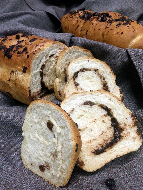 Υλικά Για τη ζύμη 100 γρ. αλεύρι για τσουρέκι 100 γρ. αλεύρι για όλες τις χρήσεις 100 γρ. αλεύρι σκληρό 20 γρ. βούτυρο 3 γρ. αλάτι 5 γρ. ξηρή μαγιά 10 γρ. ζάχαρη κρυσταλλική 180 γρ. νερό Για τη γέμιση 40 γρ. καρύδια ψιλοκομμένα 40 γρ. ζάχαρη άχνη 40 γρ. σταφίδες μαύρες 40 γρ. σταφίδες ξανθές 100 γρ. σοκολάτα κουβερτούρα υγείας ΙΟΝ χοντροκομμένη Εκτέλεση Τοποθετούμε μέσα σε μια λεκάνη όλα τα είδη των αλεύρων. Προσθέτουμε τα υπόλοιπα υλικά, βούτυρο, ξηρή μαγιά, κρυσταλλική ζάχαρη και νερό, και ανακατεύουμε με το χέρι μέχρι να αρχίσει να γίνεται ζύμη. Προσθέτουμε το αλάτι και αρχίζουμε να ζυμώνουμε για 10' περίπου με τα δύο χέρια μέχρι να γίνει μια σφιχτεί ζύμη. Για να το πετύχουμε αυτό αν χρειαστεί προσθέτουμε λίγο σκληρό αλεύρι ή λίγο νερό. Σχηματοποιούμε τη ζύμη σε μπάλα και σκεπάζουμε την επιφάνεια της με μια πετσέτα για 40' περίπου. Ανακατεύουμε όλα τα υλικά της γέμισης μέσα σε μια λεκάνη με το χέρι. Στη συνέχεια πλάθουμε τη ζύμη για 1' και με τα δύο χέρια και την ανοίγουμε με ένα πλάστη σε σχήμα τετράγωνο και σε πάχος 1 εκατοστό περίπου. Απλώνουμε σε όλη την επιφάνεια τα υλικά της γέμισης και διπλώνουμε τη ζύμη σε ρολό. Τοποθετούμε σε μακρόστενη κατά προτίμηση φόρμα του κέικ, ή όποιο σχέδιο φόρμας του κέικ υπάρχει, η όποια είναι σεμιζαρισμένη με βούτυρο και αλεύρι και χαράζουμε την επιφάνεια με ένα μαχαιράκι εγκάρσια σε 3 σημεία σε ίσες αποστάσεις. Σκεπάζουμε με μια πετσέτα την επιφάνειά του. Προθερμαίνουμε το φούρνο στους 100 °C και τοποθετούμε μέσα σε αυτόν ένα ταψάκι με καυτό νερό. Μόλις φτάσει τη θερμοκρασία κλείνουμε το φούρνο και τοποθετούμε τη ζύμη του ψωμιού που βρίσκεται μέσα στη φόρμα με τη πετσέτα στην επιφάνειά του μέσα στο κλειστό αλλά ζεστό φούρνο. Μόλις σχεδόν διπλασιαστεί σε σχέση με τον αρχικό του όγκο αποσύρουμε τη φόρμα από το φούρνο και το ταψάκι με το νερό και προθερμαίνουμε στους 180 °C . Ξανατοποθετούμε τη φόρμα στο φούρνο και ψήνουμε για 40' περίπου. Τέλος ξεφορμάρουμε το ψωμί από τη φόρμα πάνω σε μια σχάρα και το αφήνουμε να κρυώσει. Πηγή: https://www.ionsweets.gr/