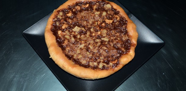 Συστατικά Για το ζυμάρι 10 γρ. ξηρή μάγια 250 γρ. αεριούχο νερό 25 γρ. βούτυρο 10 γρ. αλάτι 5 γρ. ζάχαρη λευκή κρυσταλλική 50 γρ. ηλιέλαιο 400 γρ. αλεύρι σκληρό 100 γρ. αλεύρι μαλακό Για τη γέμιση 100 γρ. κρέμα γάλακτος 100 γρ. βούτυρο 500 γρ. σοκολάτα κουβερτούρα γάλακτος ΙΟΝ χοντροκομμένη 100 γρ. Πεκάν χοντροκομμένο 80 γρ. σοκοφρέτα ΙΟΝ Εκτέλεση Ζυμάρι Τοποθετούμε όλα τα υλικά με τη σειρά που αναφέρονται μέσα στο κάδο του μίξερ με το γάντζο και ανακατεύουμε στην αργή ταχύτητα. Τέλος προσθέτουμε το σκληρό και το μαλακό αλεύρι και συνεχίζουμε το ανακάτεμα μέχρι να γίνει μια ομοιογενής ζύμη. Αφήνουμε τη ζύμη να ξεκουραστεί σκεπασμένη με αντικολλητικό χαρτί για 15' περίπου. Χωρίζουμε τη ζύμη σε δύο ίσα μέρη και την σχηματοποιούμε σε μπαλάκια. Το ένα μπαλάκι το ανοίγουμε σε στρογγυλό σχήμα με το πλάστη και τοποθετούμε μέσα σε στρογγυλό ταψάκι σεμιζαρισμένο, με βούτυρο και αλεύρι, και απλώνουμε σε όλη την εσωτερική επιφάνεια μέχρι και τα τοιχώματα. Τρυπάμε με ένα πιρούνι και την αφήνουμε στην άκρη για 20' περίπου μέχρι να φουσκώσει ελαφρώς. Γέμιση Τοποθετούμε μέσα σε μια κατσαρόλα και σε μέτρια φωτιά τη κρέμα γάλακτος και το βούτυρο και μόλις βράσουν προσθέτουμε τη χοντροκομμένη σοκολάτα γάλακτος. Ανακατεύουμε με ένα σύρμα μέχρι να λιώσει εντελώς η σοκολάτα. Προσθέτουμε και το χοντροκομμένο πεκάν και αποσύρουμε από τη φωτιά. Τοποθετούμε τη γέμιση σε όλη την επιφάνεια της ζύμης της πίτσας και σπάμε ακανόνιστα τη σοκοφρέτα. Ψήνουμε στους 180 °C για 40' περίπου. Αφήνουμε τη πίτσα να κρυώσει για 30' και ξεφορμάρουμε. Τοποθετούμε σε πιατέλα της αρεσκείας μας. Πηγή: https://www.ionsweets.gr/