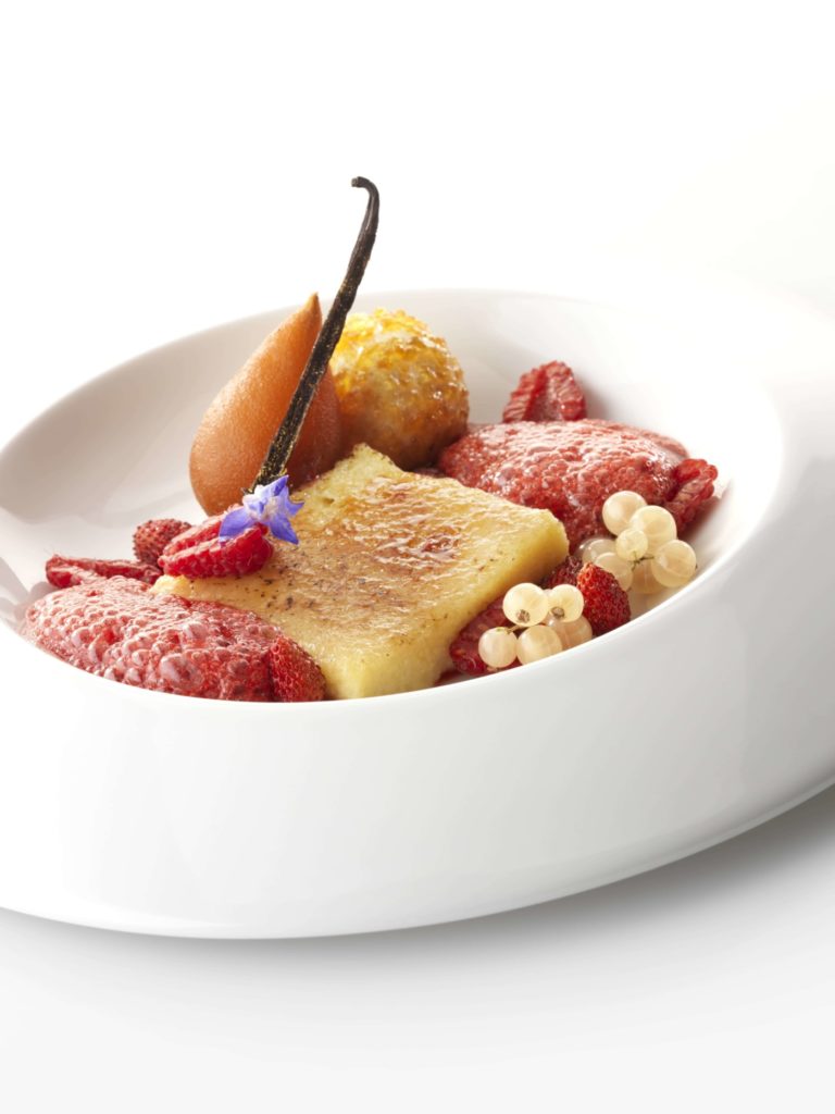 2. Place the mocha pear beside it and garnish with the red fruit and sparkling raspberry coulis.