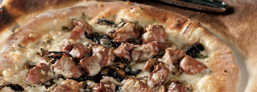 - Την αλείφουμε με το λιωμένο σκόρδο, την καυτερή πιπερίτσα, πασπαλίζουμε με το θυμάρι, απλώνουμε το τριμμένο τυρί, τα μανιτάρια και στο τέλος τα συκωτάκια πουλιών.